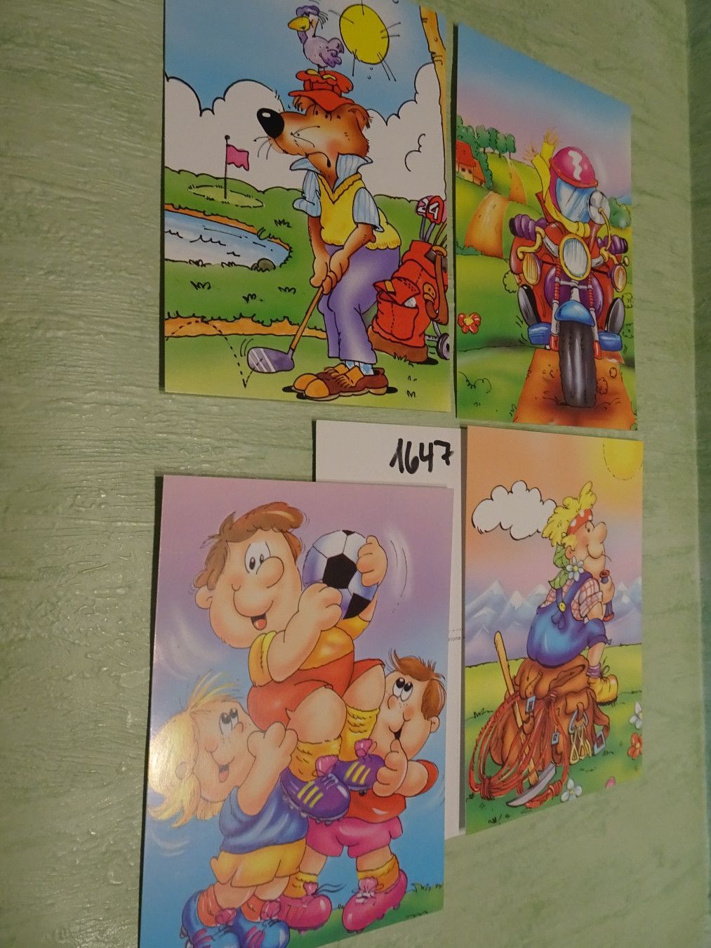 4 ältere Postkarten Kartos Mntecatini Italien Humor Sport Golf Fußball Motorrad