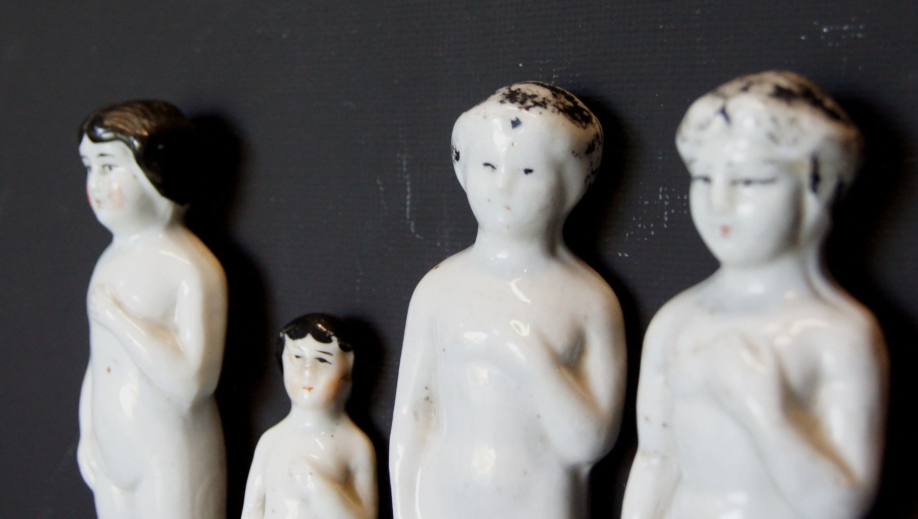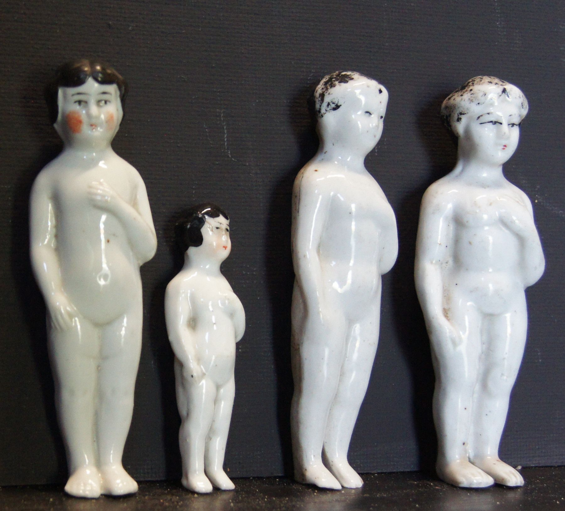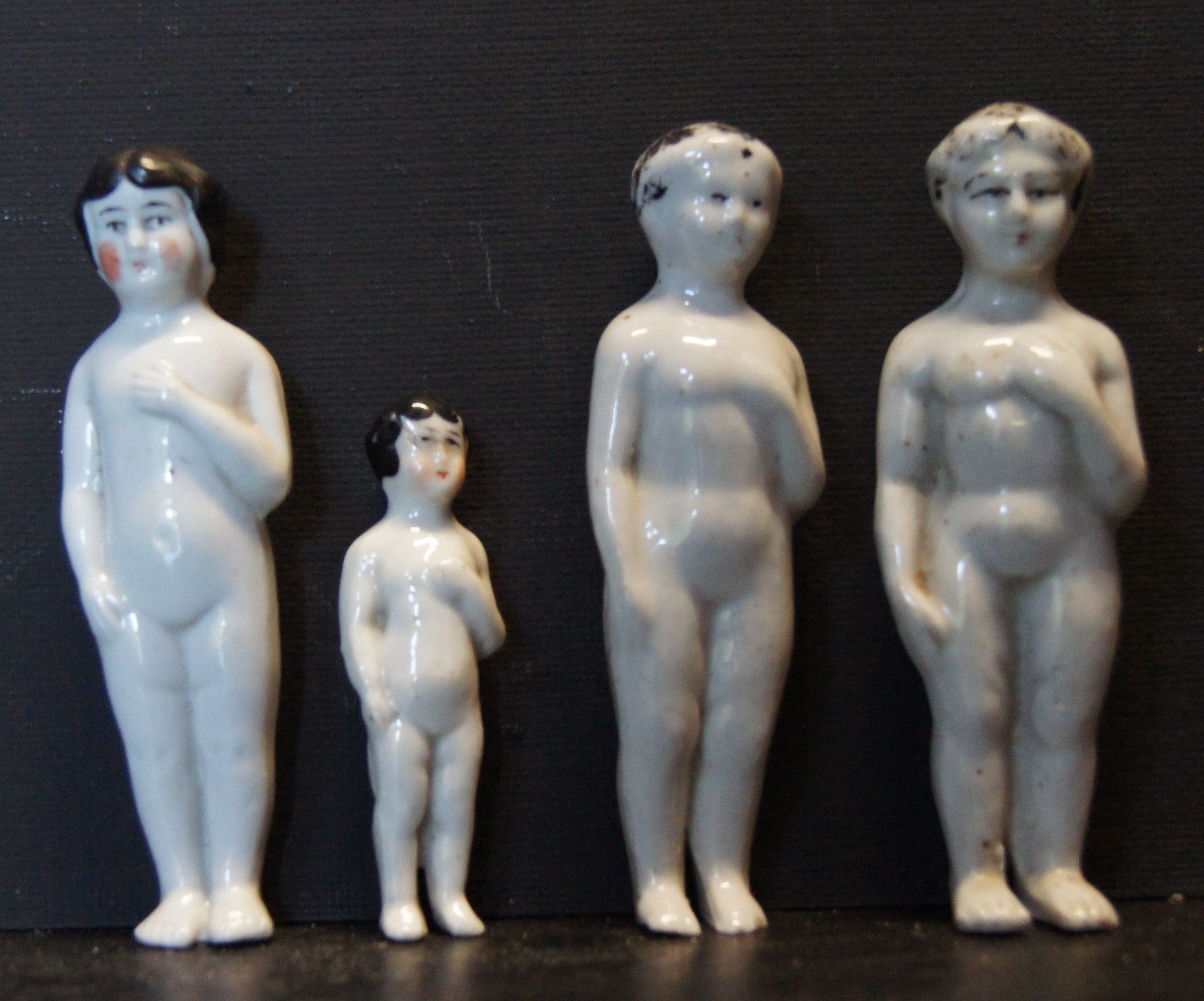 4 Badepuppen um 1850. Porzellan. Ohne Marken. Rückseiten ohne Glasur. Bemalung teilweise abgespielt. Maße: H 9-13 cm. Antikes am Deich - Inh: Oliver Kipp-Trense