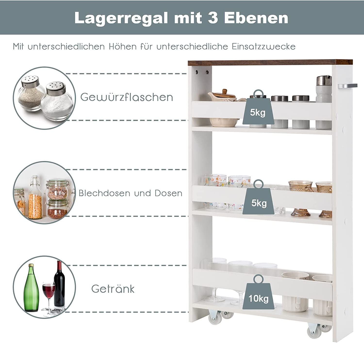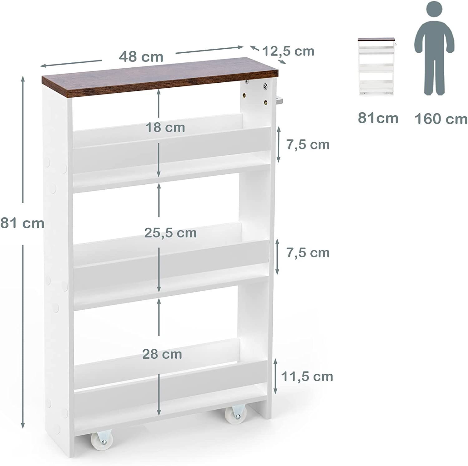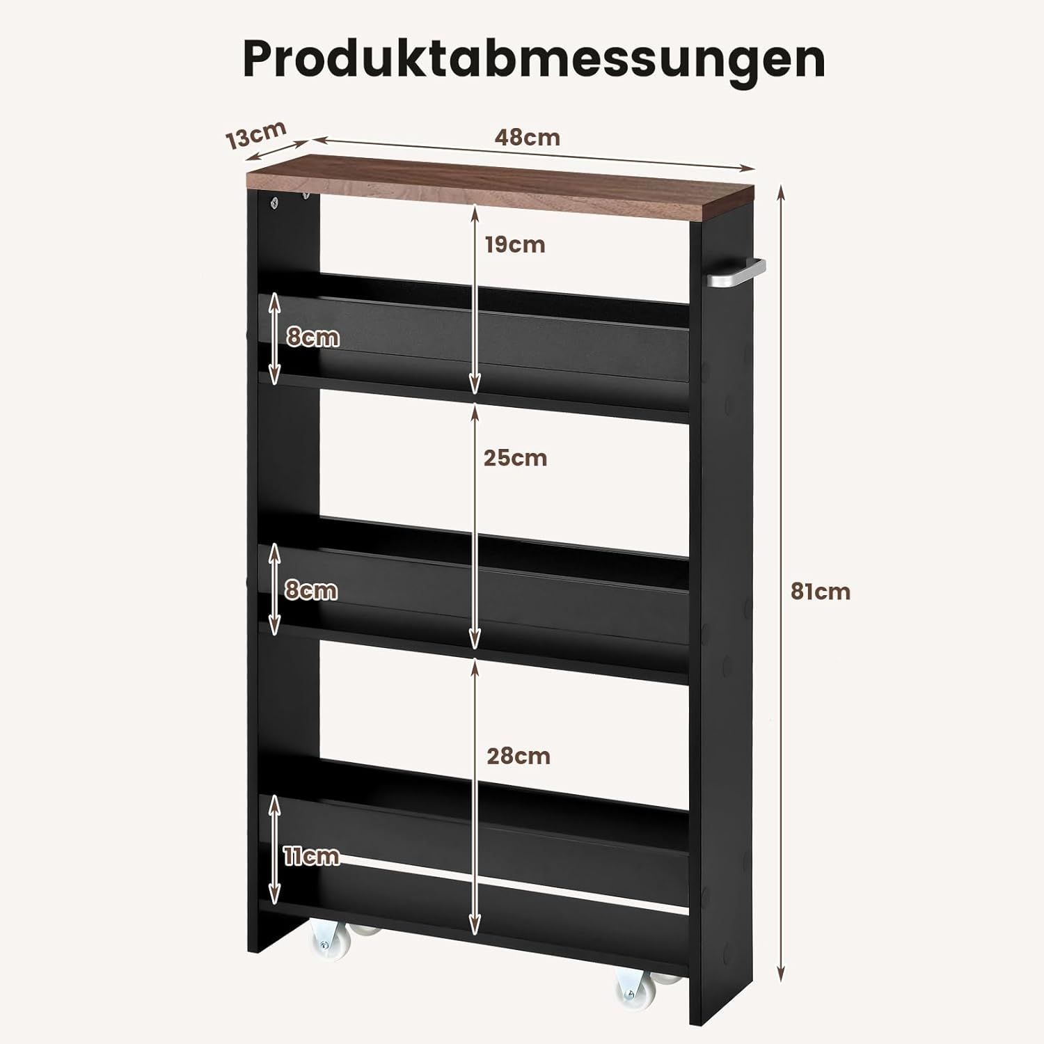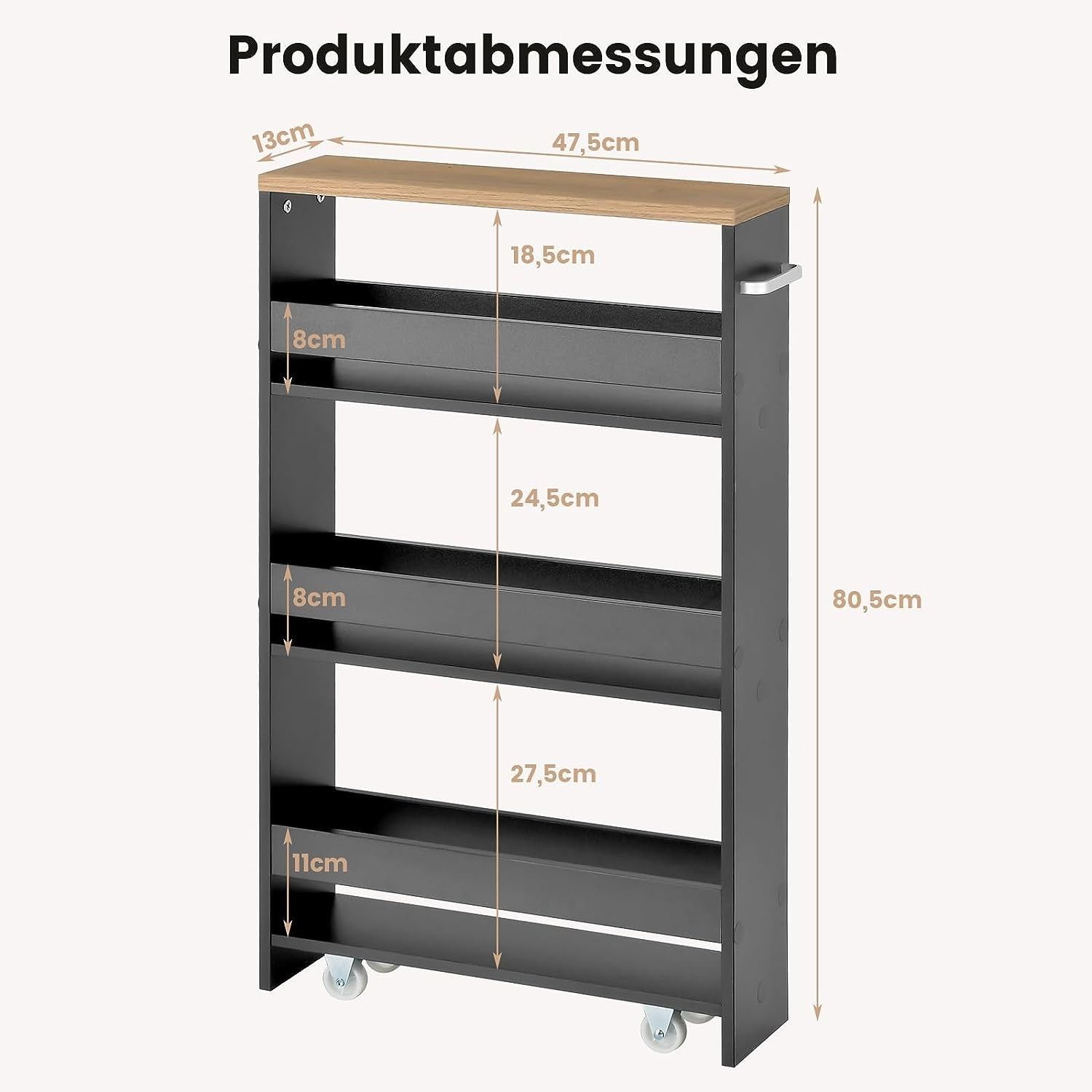 4 Ebenen Nischenregal auf Rollen, Küchenwagen schmal, Badregal mit seitlichem Griff