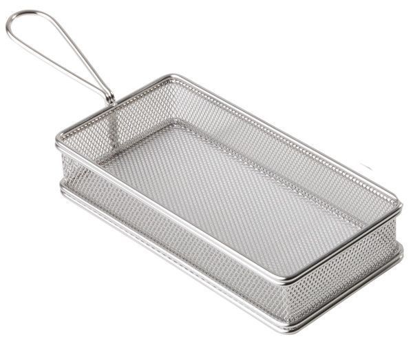 Ausführung: 4 x Frittierkorb aus Edelstahl, poliert mit Griff, Länge 90 mm ideal zum originellen Servieren von kleinen Snacks auch zum Frittieren selbst geeignet spülmaschinenfest Abmessungen: (BxTxH): 260 x 130 x 50 mm