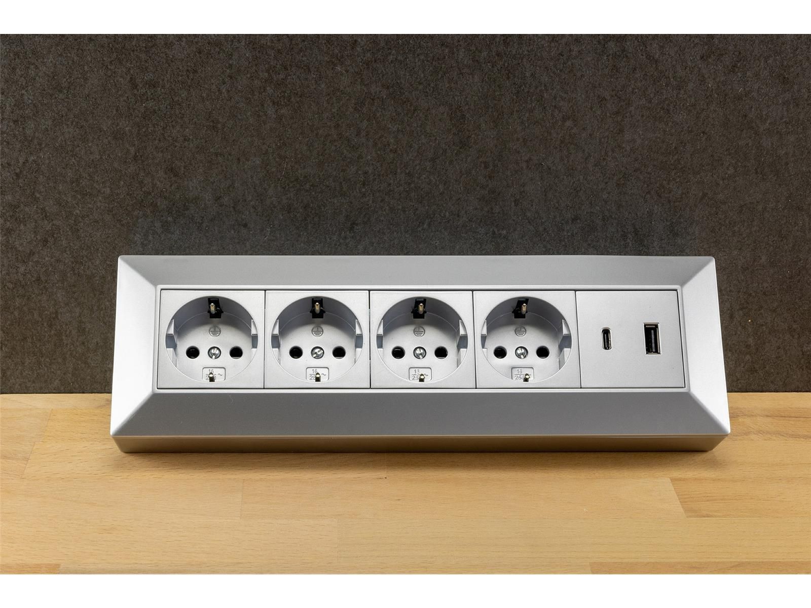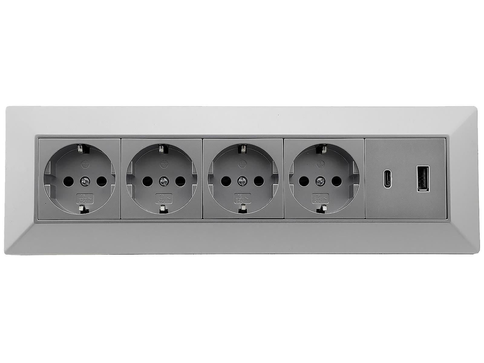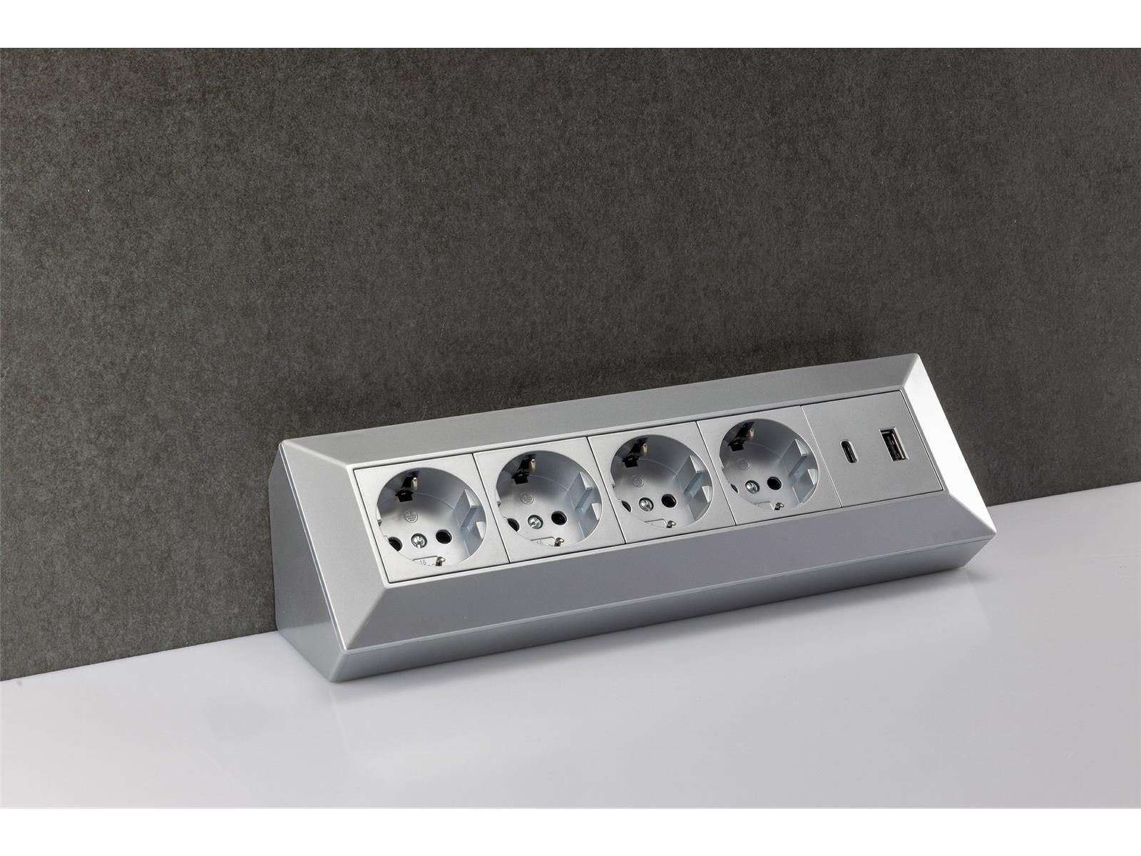 ChiliTec 4-fach Steckdosenblock, USB-A+C, silber 250V / 16A, Aufbaumontage, USB 3,1A, PD