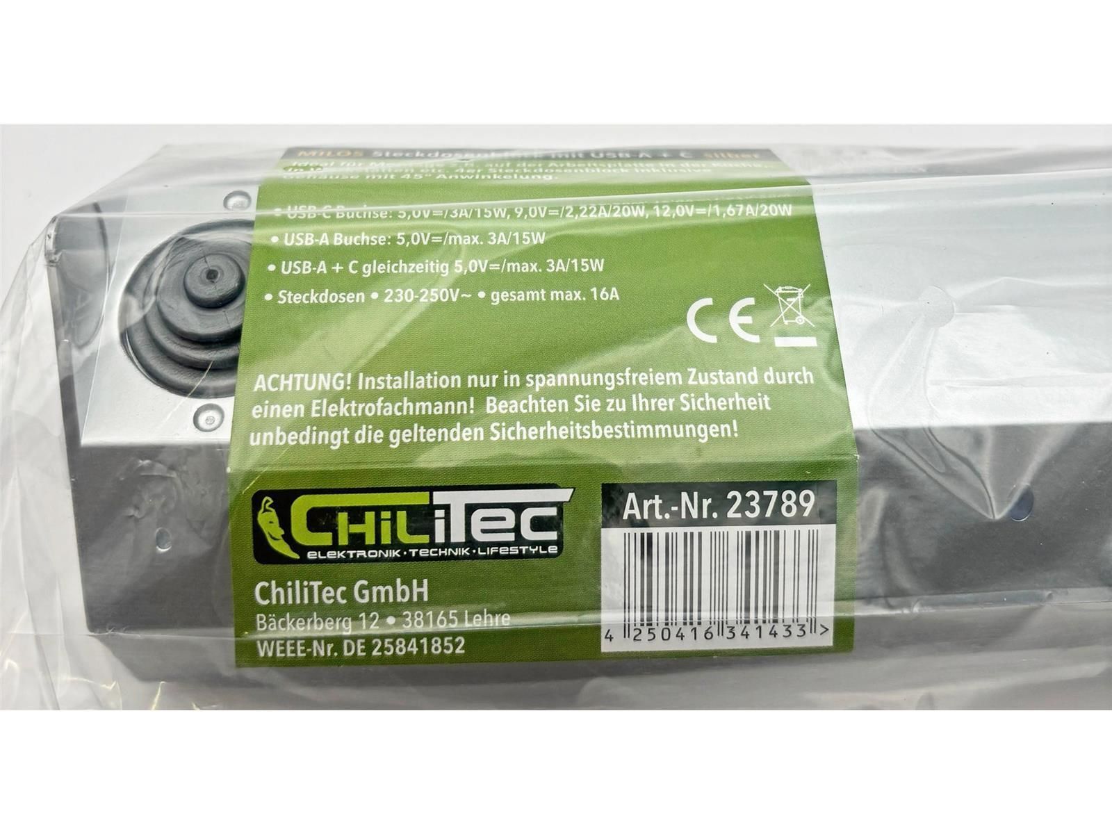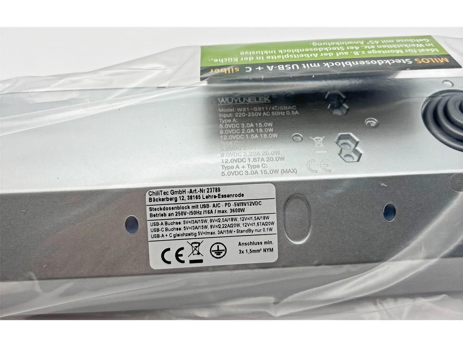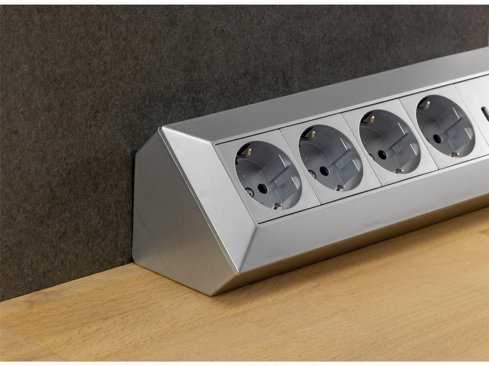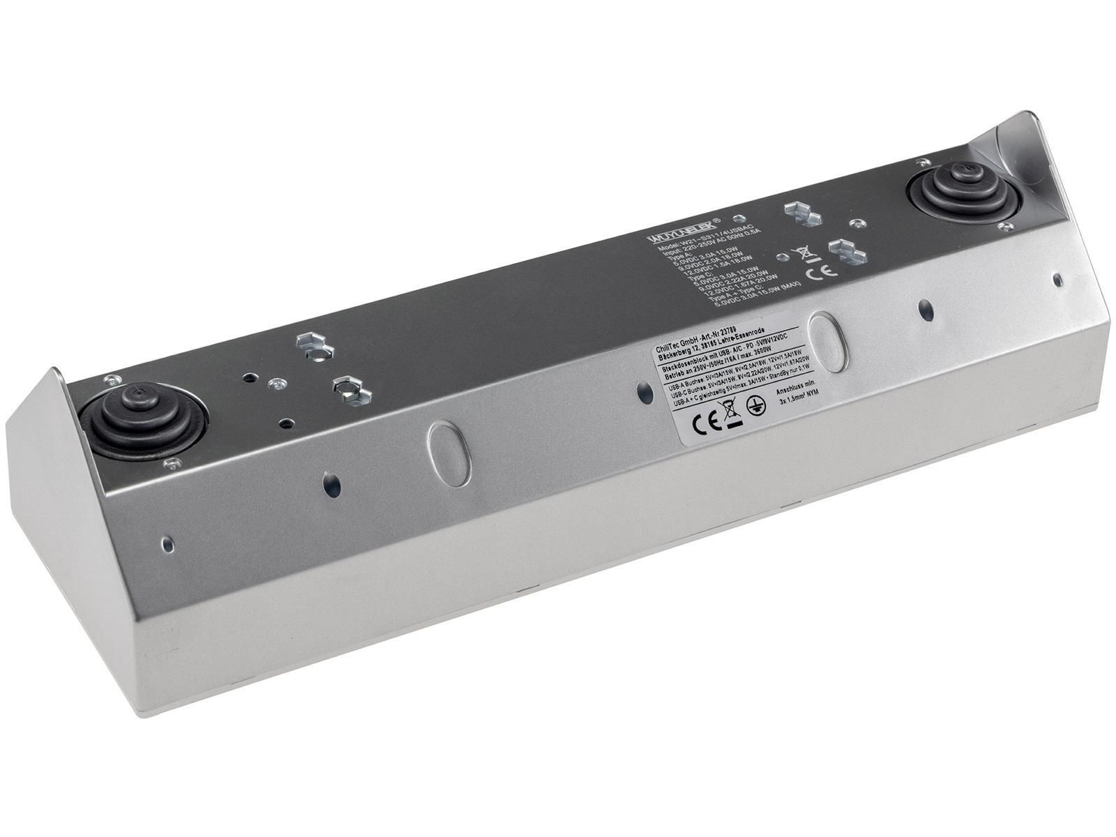 ChiliTec 4-fach Steckdosenblock, USB-A+C, silber 250V / 16A, Aufbaumontage, USB 3,1A, PD