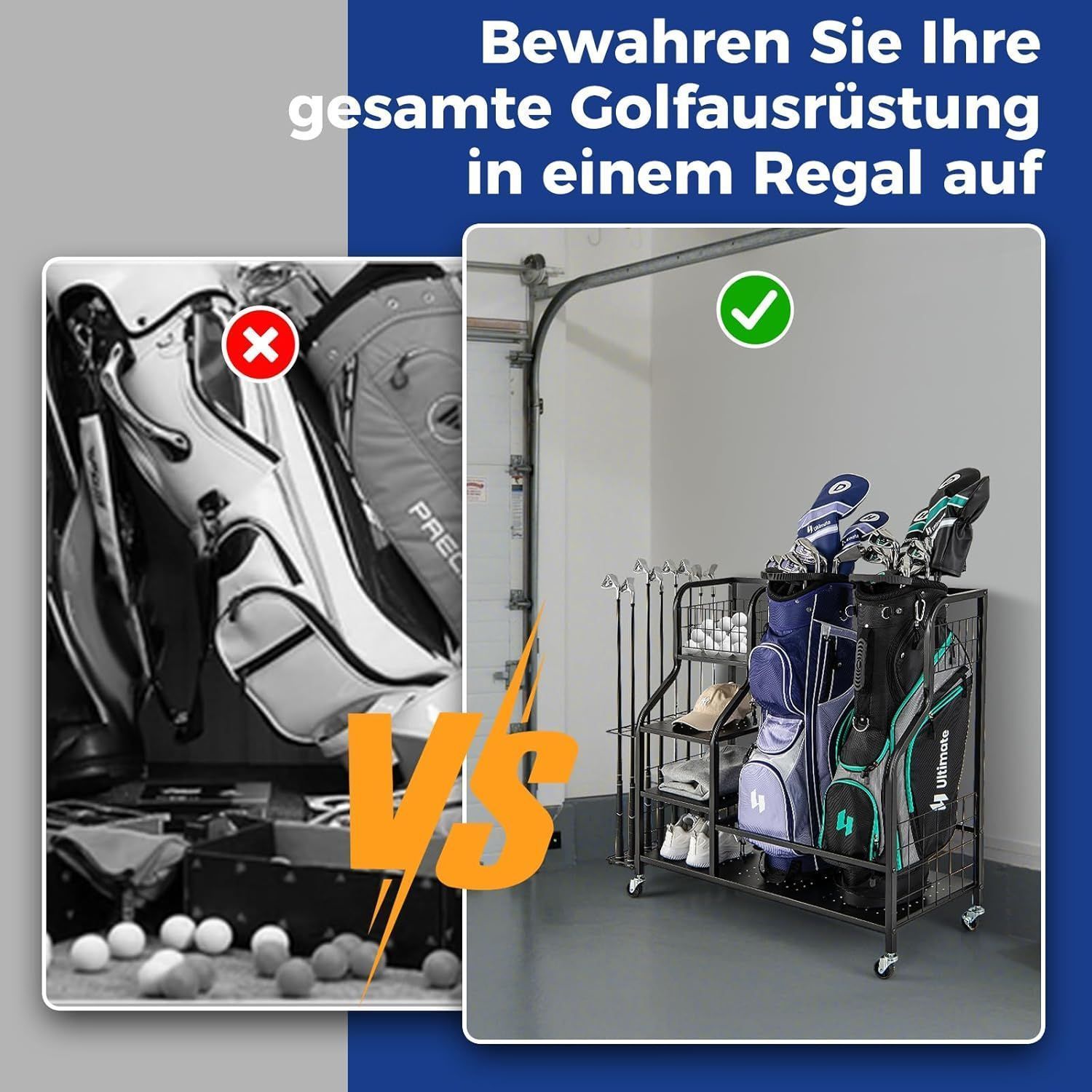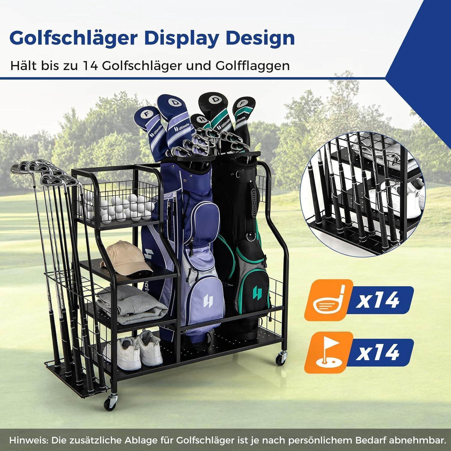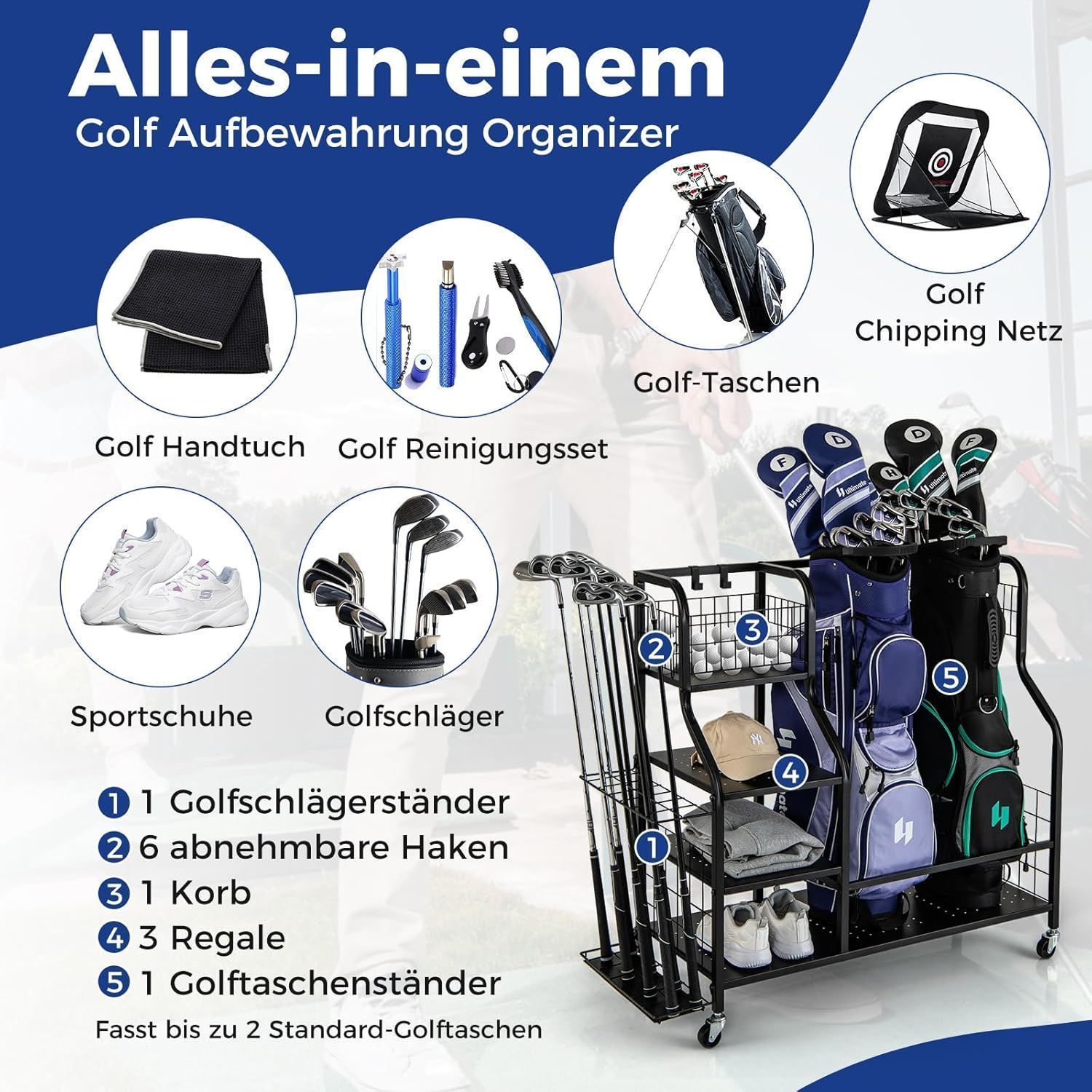 4 in 1 Golf Organizer, Golfschläger-Organizer mit Rollen, für 2 Golftaschen