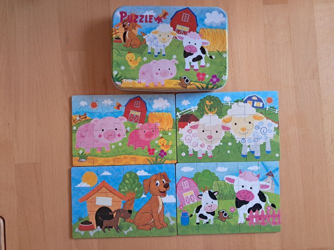 Ich biete hier diese 4 kleine Puzzle in einer süßen Blechdose. Die Puzzle haben 9, 12, 15 und 20 Teile, je 10 x 16 cm groß. Sie sind bespielt, aber eher selten, daher sehr guter Zustand. Danke fürs Anschauen, hab noch mehr eingestellt!