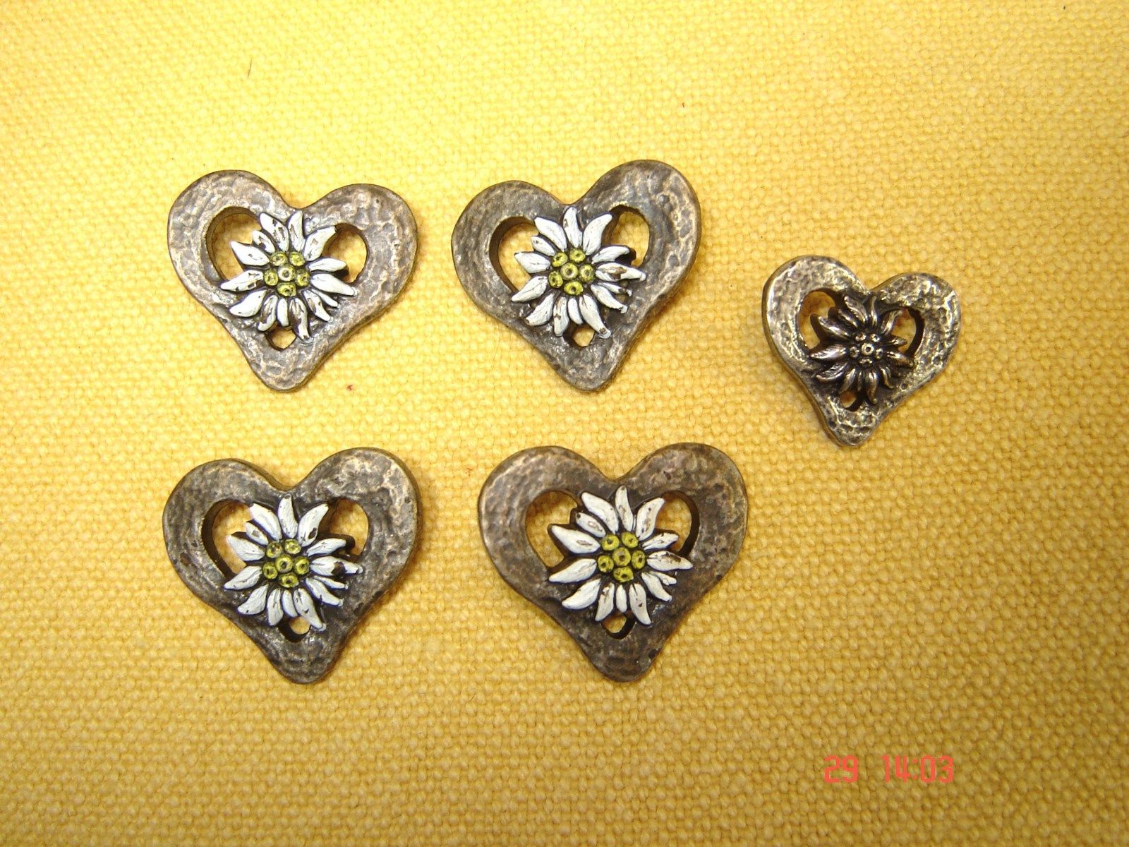 4 Knöpfe Herz m Edelweiß rustikal altkupferfb handbemalt 2,5 cm plus 1 kleiner extra