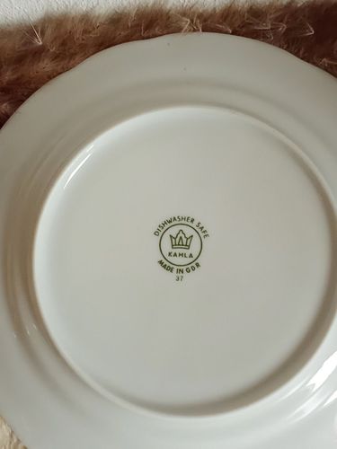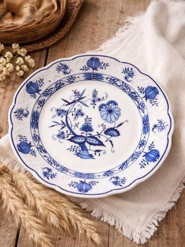 Zum Verkauf stehen 4 schöne Kuchenteller aus Porzellan des renommierten Herstellers KAHLA, gefertigt in der DDR (Made in GDR). Die Teller sind mit einem klassischen blau-weißen Zwiebelmuster dekoriert und bestechen durch ihre wellenförmigen, reliefierten Ränder. Das zeitlose florale Dekor macht dies
