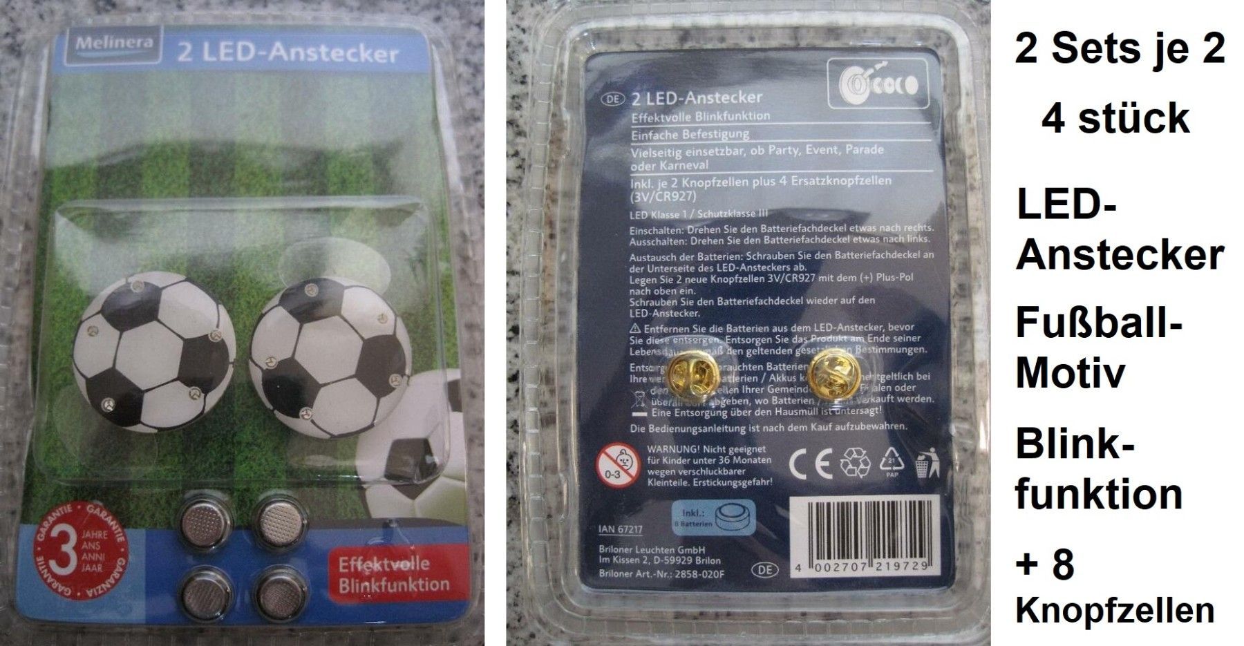 4 LED-Anstecker mit Fußball-Motiv Blinkfunktion + 8 Knopfzellen. NEU und in der Originalverpackung. Effektvolle Blinkfunktion. Einfache Befestigung. Vielseitig einsetzbar, ob Party, Event, Parade oder Karneval. Inkl. je 4 Knopfzellen Versandkosten: 2,90 Euro oder abholen.