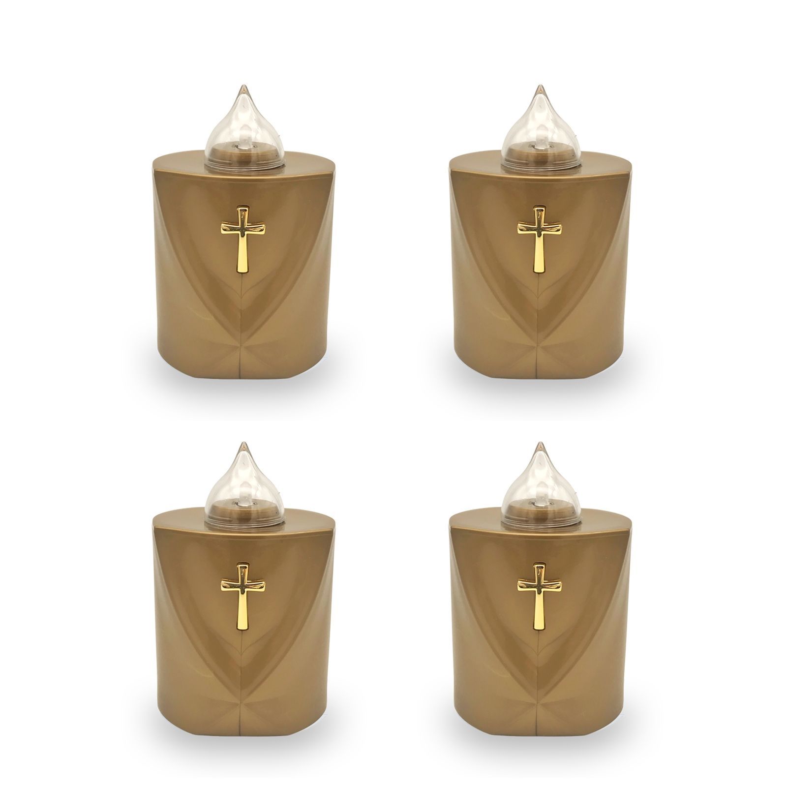 4 LED Grabkerzen Flackereffekt lange Brenndauer Trauerlicht gold Heiliges Kreuz