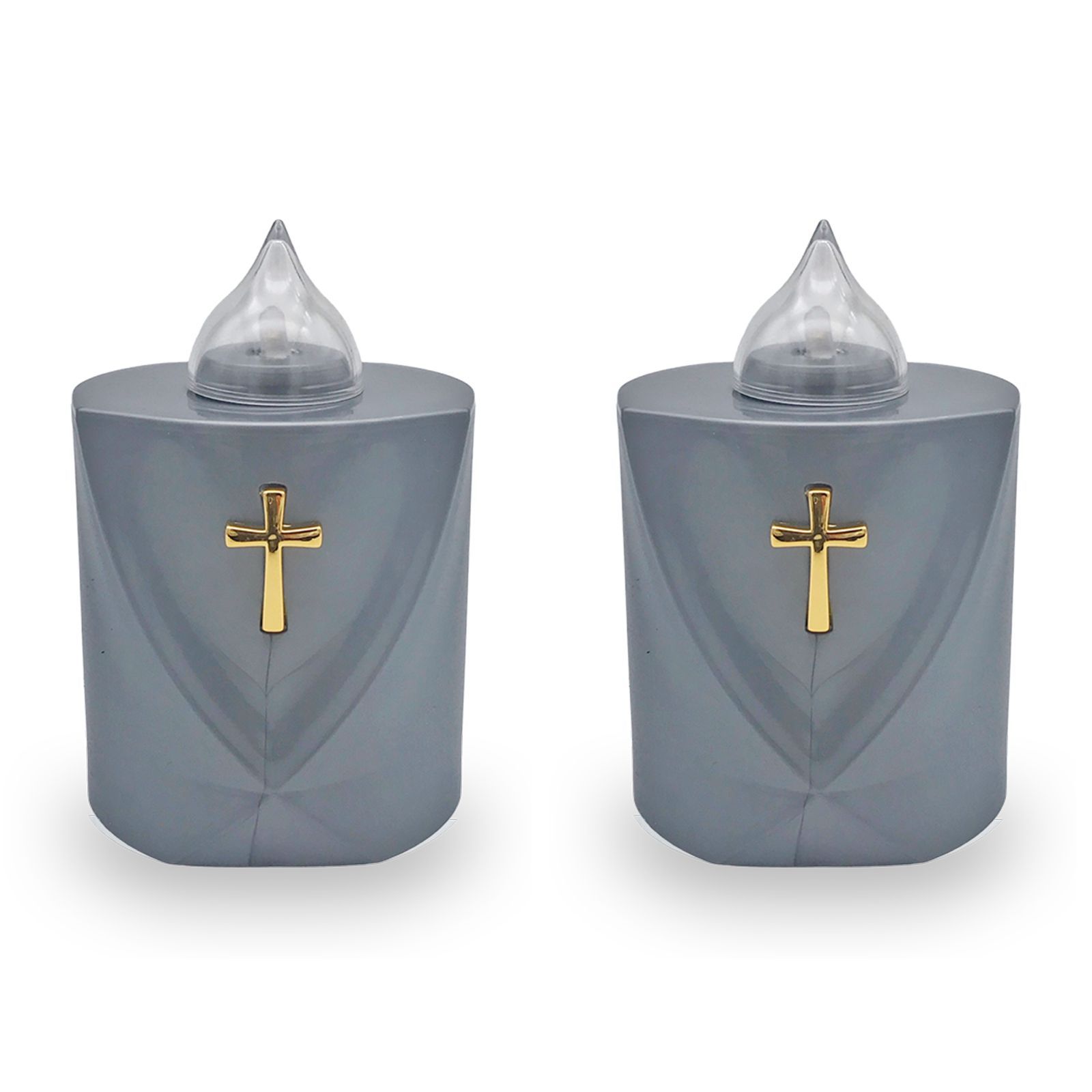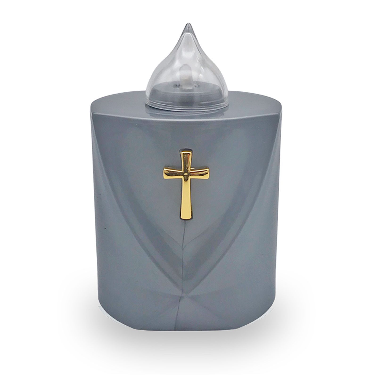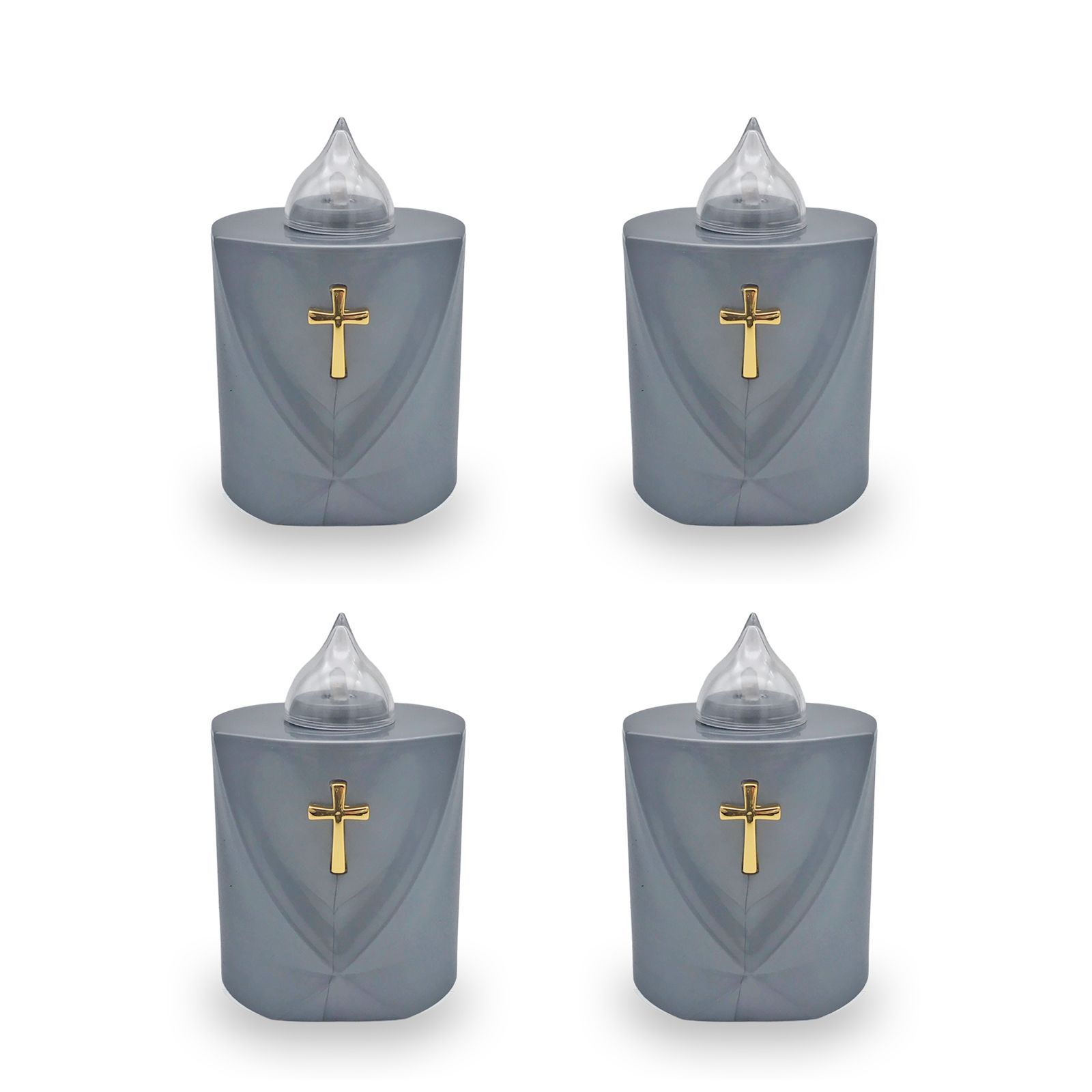 4 LED Grabkerzen Flackereffekt lange Brenndauer Trauerlicht silber Heiliges Kreuz