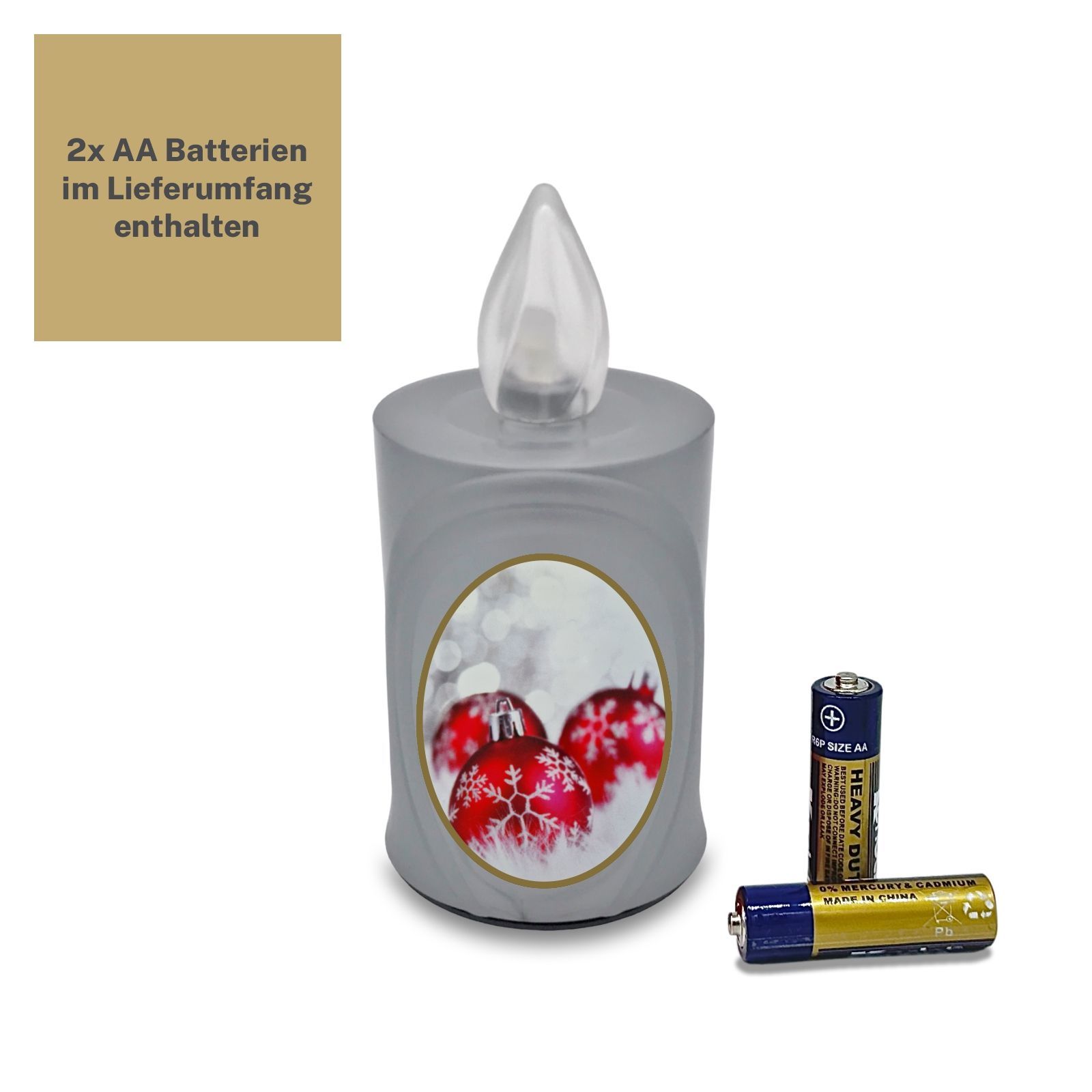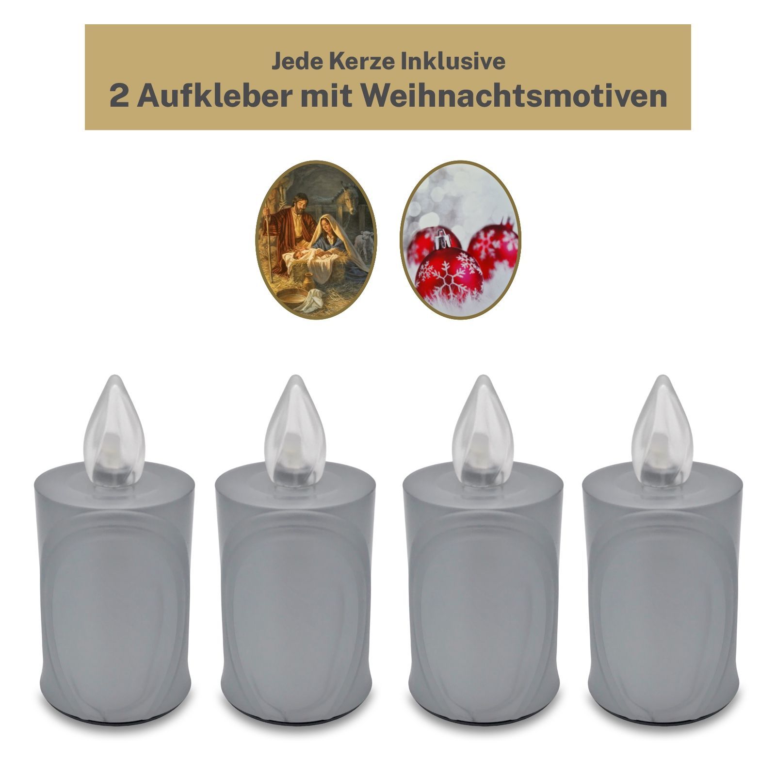 4 LED Weihnachtskerze Flackereffekt lange Brenndauer silber mit Weihnachtsmotiv