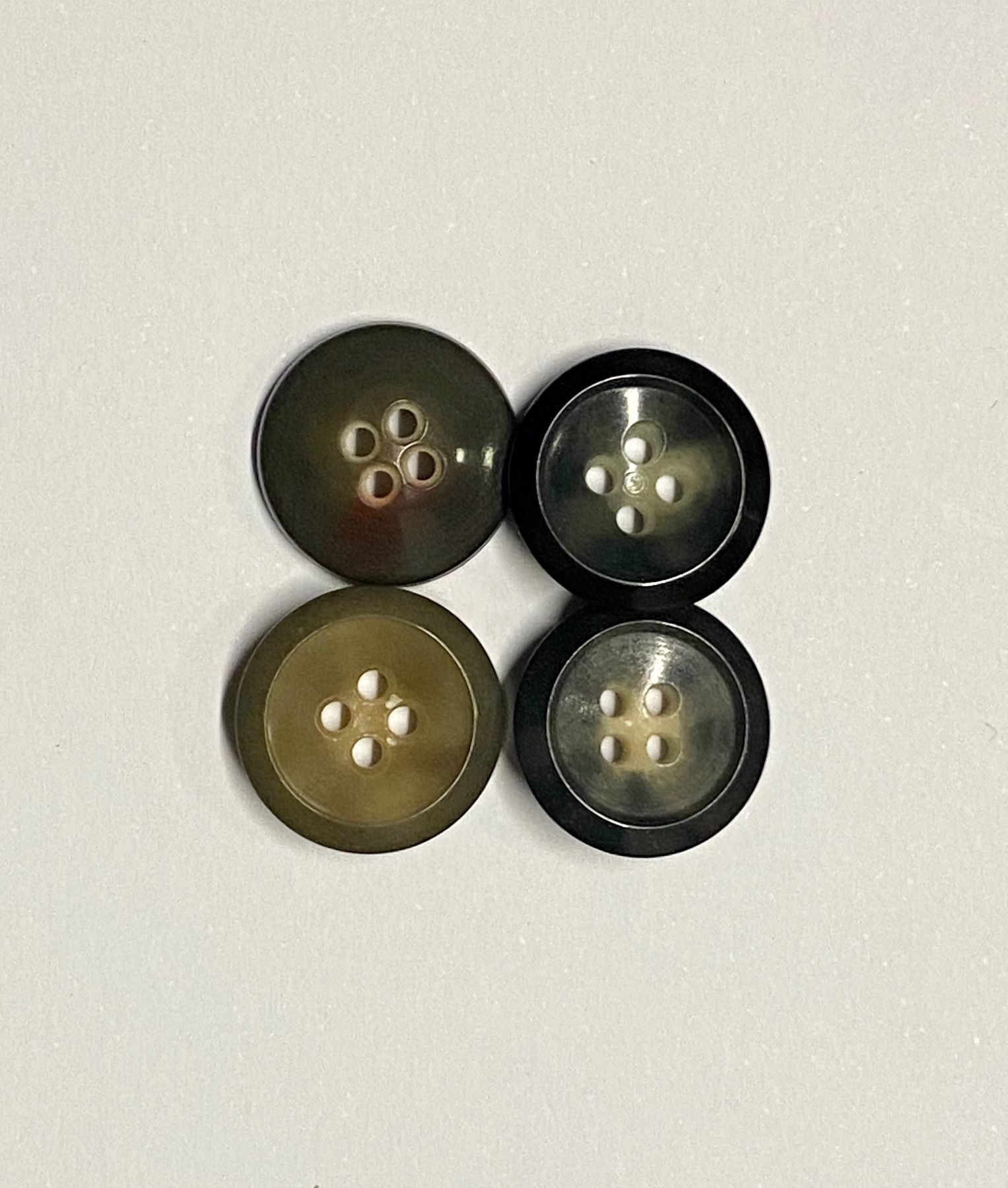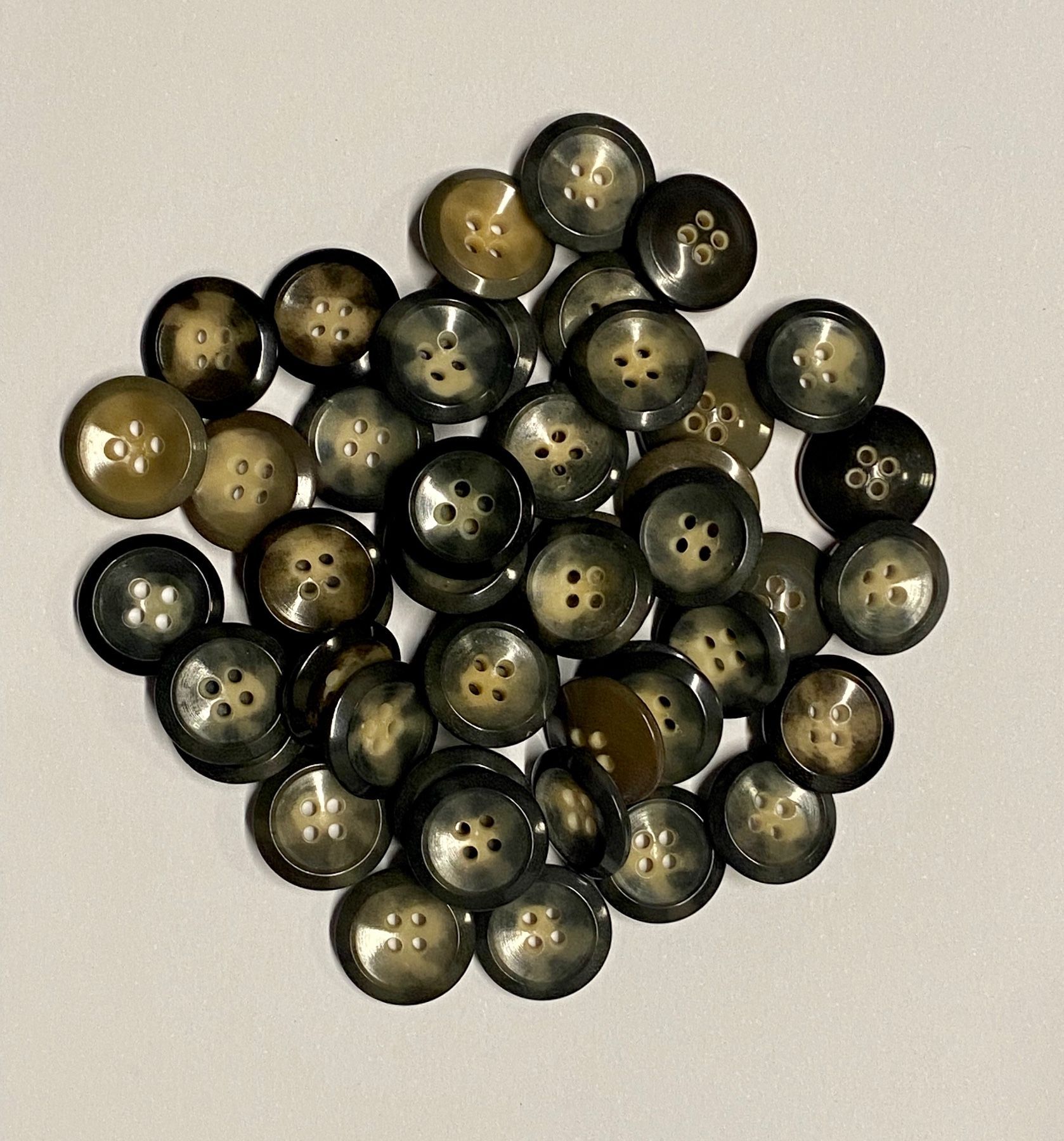 Durchmesser ca. 15 mm - Mischung kleiner 4-Loch Knöpfe in grau-, schwarz-, braun marmoriert Duchmesser ca. 15 mm Befestigung 4-Loch Wir verkaufen diesen Knopf in Packungen zu ca. 25 g (ca.42 Stück)