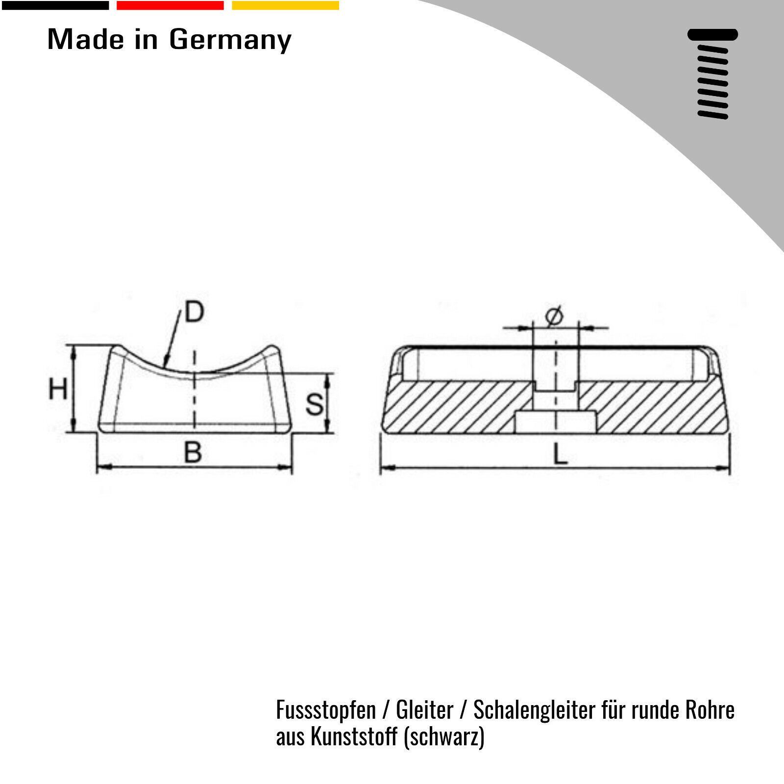 4 Möbelgleiter Schalengleiter für runde Rohre Die Abmessungen 18mm, 28mm, 45mm haben 2 B ohrungen Die Abmessungen 22mm und 40mm haben eine Bohrung Das angegebene Maß ist das Rohraußenmaß Material: Kunststoff Farbe: Schwarz