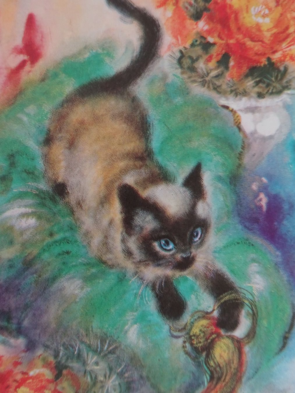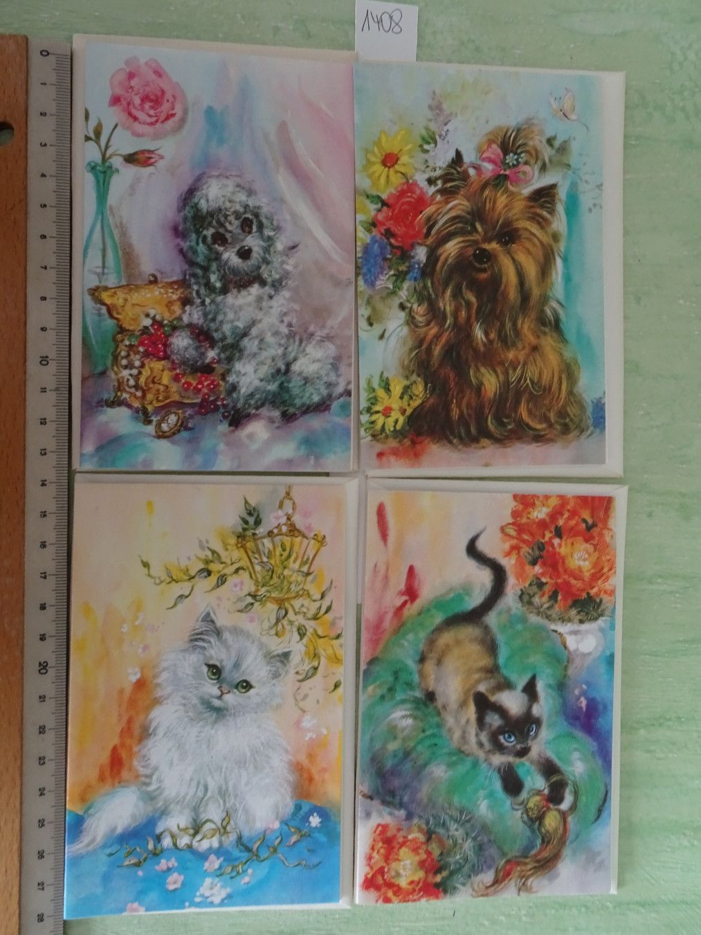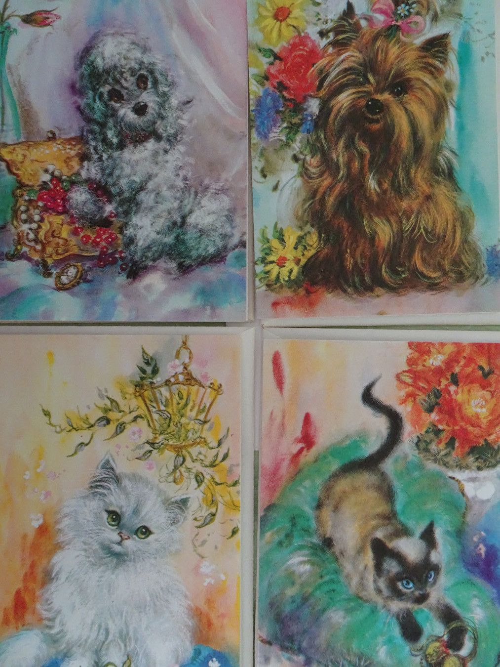 4 mini Grußkarten England Tiere wie gemalt Hunde Katzen RAR