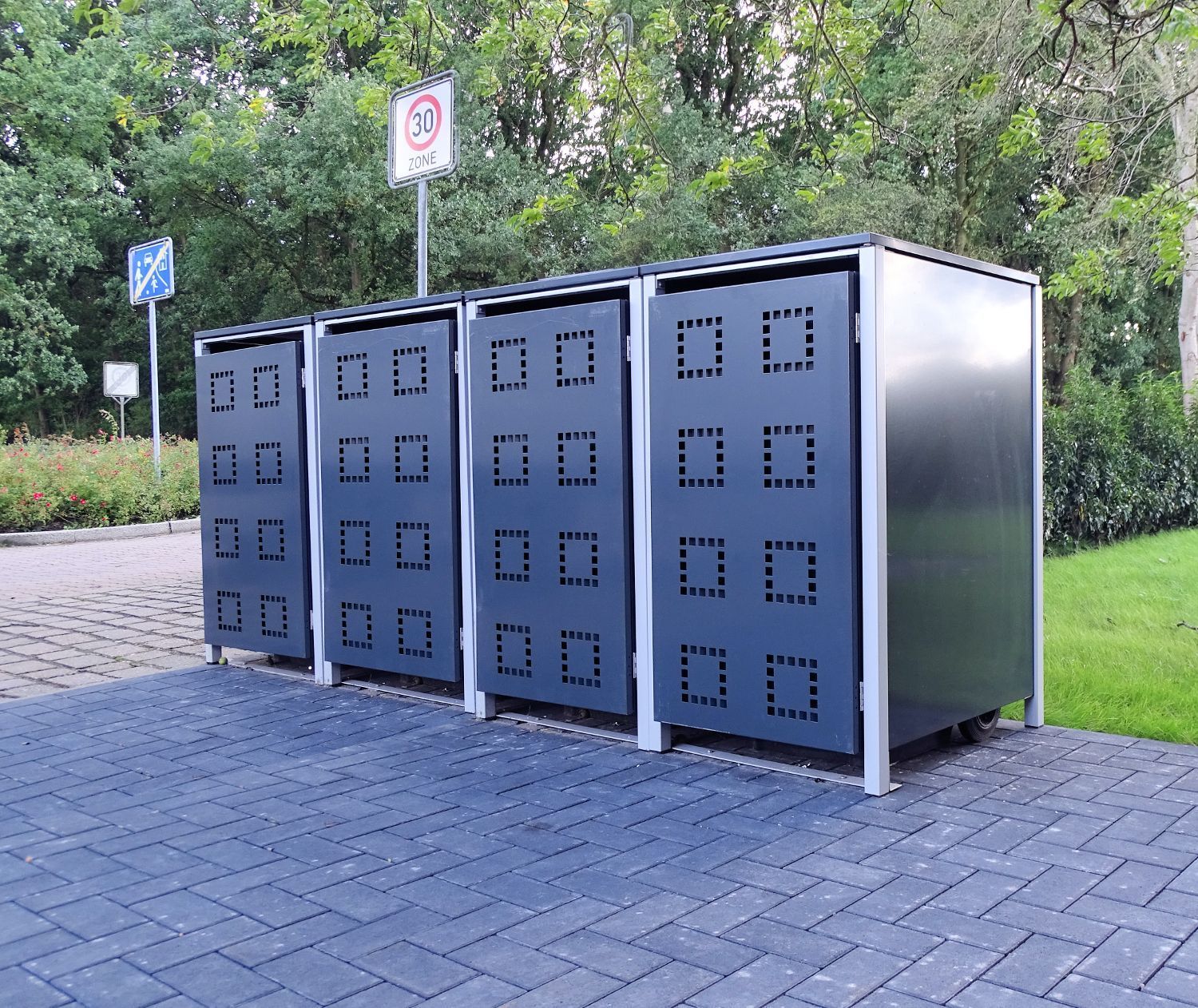 4 Mülltonnenboxen Modell No.5 Anthrazitgrau für 120 Liter Mülltonnen / witterungsbeständig durch Pulverbeschichtung / mit Klappdeckel und Fronttür