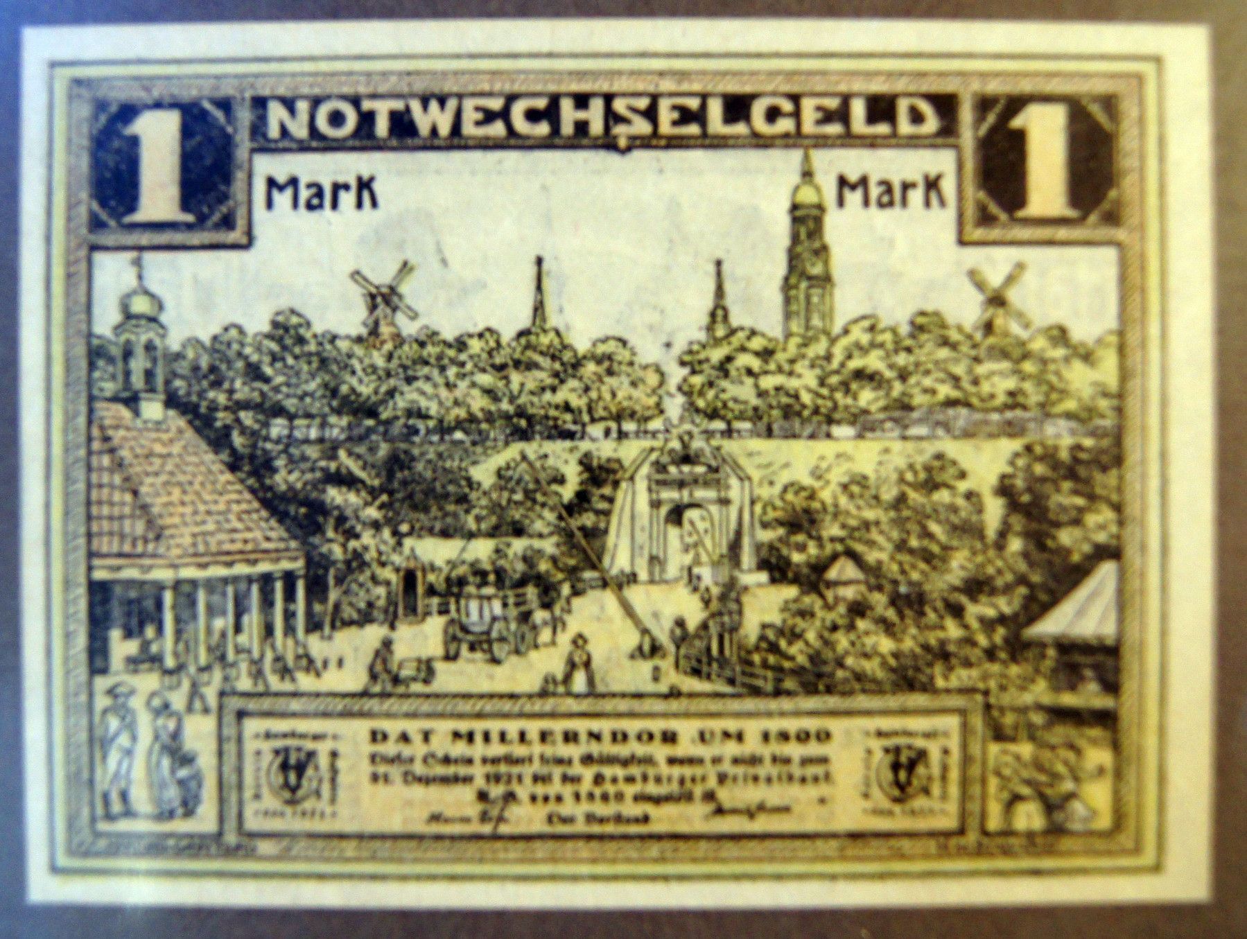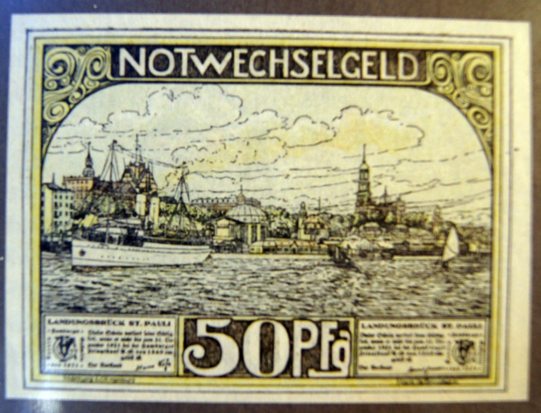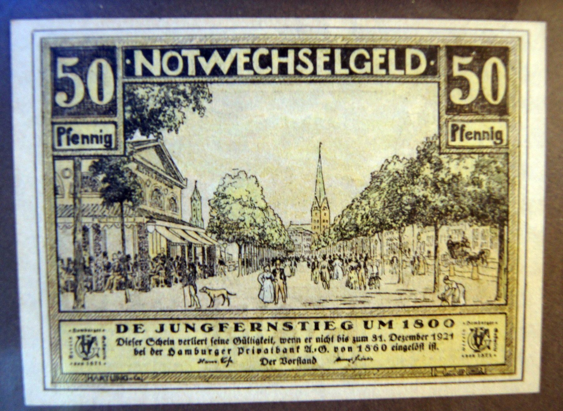 4 Notgeld-Scheine von 1921. Hamburg. Im stilvollen Rahmen. Maße: Rahmen H 37,5; B 20,5 cm. Antikes am Deich - Inh: Oliver Kipp-Trense