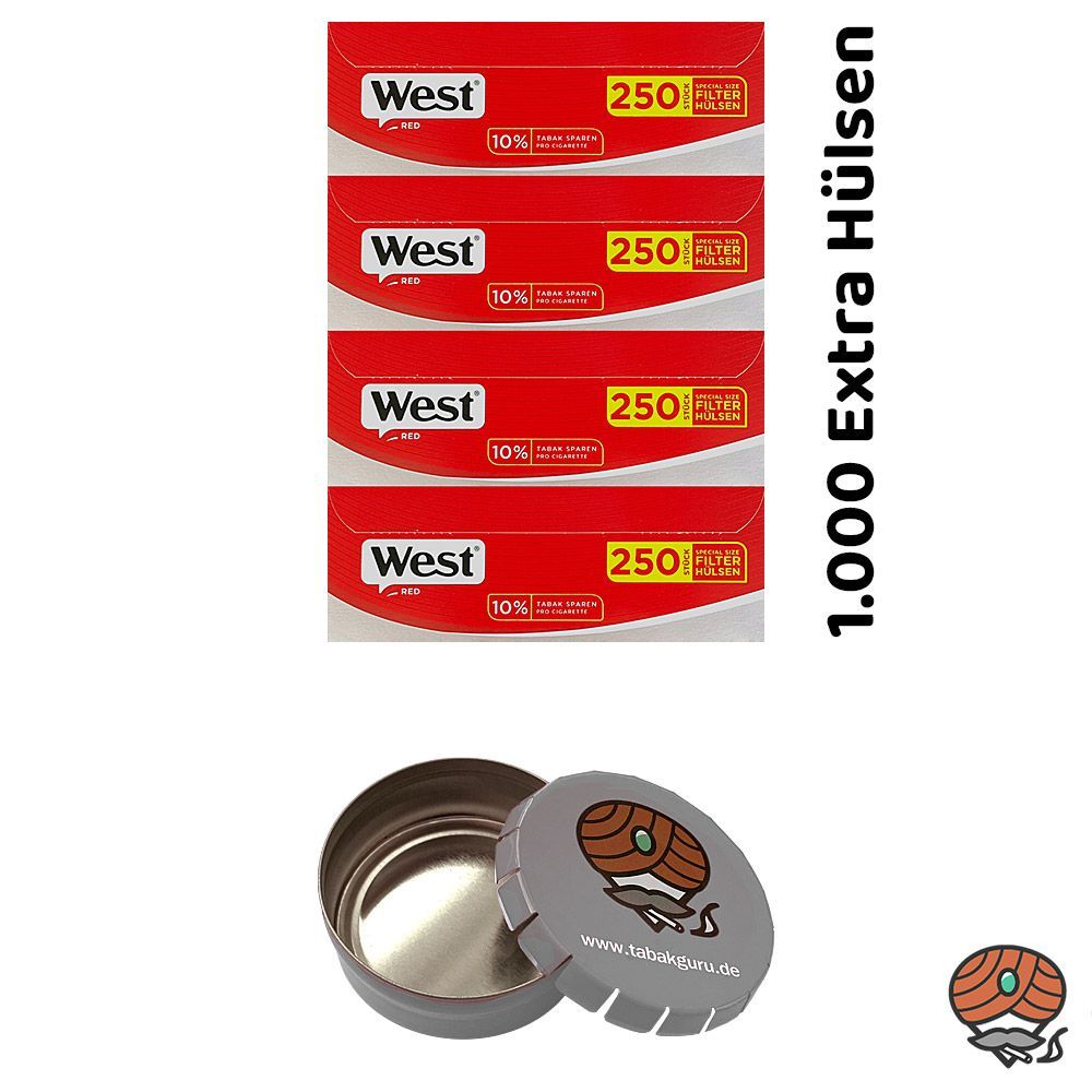 1.000 West Extra Filterhülsen + 1 Taschenaschenbecher (nicht wählbar) Hülsen: Bei den Filterhülsen handelt es sich um Extra Filterhülsen mit langem Filter und kurzem Füllraum. In Abhängigkeit von der Stopffestigkeit und den persönlichen Stopfgewohnheiten können bei Verwendung der Extra Hülsen bis ca
