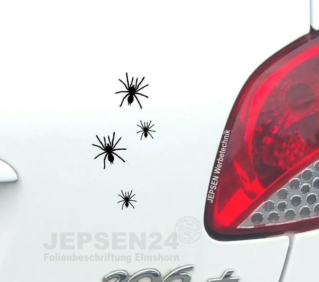 Aufkleber Set Spinnen Farbe: andere Farbe nach Wunsch mitteilen. 4 Spinnen Aufkleber Set: 2x 3,5cm und 2x ca 2cm Ideal zum abdecken von Steinschlag und kleinen Kratzern oder Bohrlöchern geeignet Beispiel 2cm: Für den EU Ring am hinteren Kennzeichen. Passt genau in den EU Sterne Ring rein. Beispiel 3,5cm: Seit 2010 gibt es keine AU Plakette mehr für ihr vorderes Nummernschild ! Da ist doch gleich Platz für einen kleinen Aufkleber !?