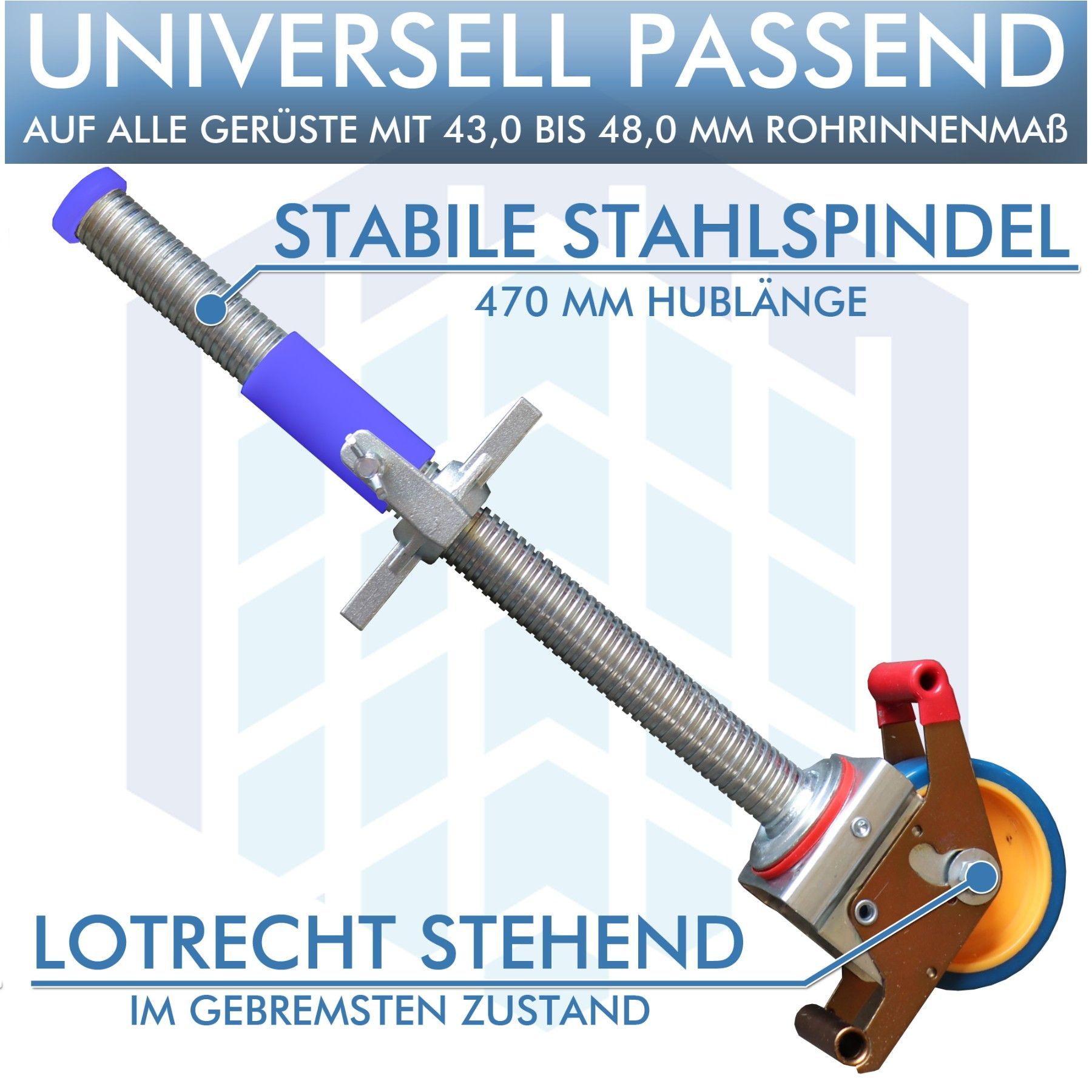 4er-Set Gerüstrolle, universal kompatibel zu KRAUSE* PRO-TEC S10, STABILO S10, STABILO 50 500 5000 5500, STABILO 100 1000. Nach Entfernen der Führungshülse und Zentrierkappe auch für KRAUSE*-Gerüste mit Fahrbalken (38 mm bis 43 mm Rohrinnenmaß) geeignet. Passt nicht auf: KRAUSE* ClimTec-Gerüste Roll
