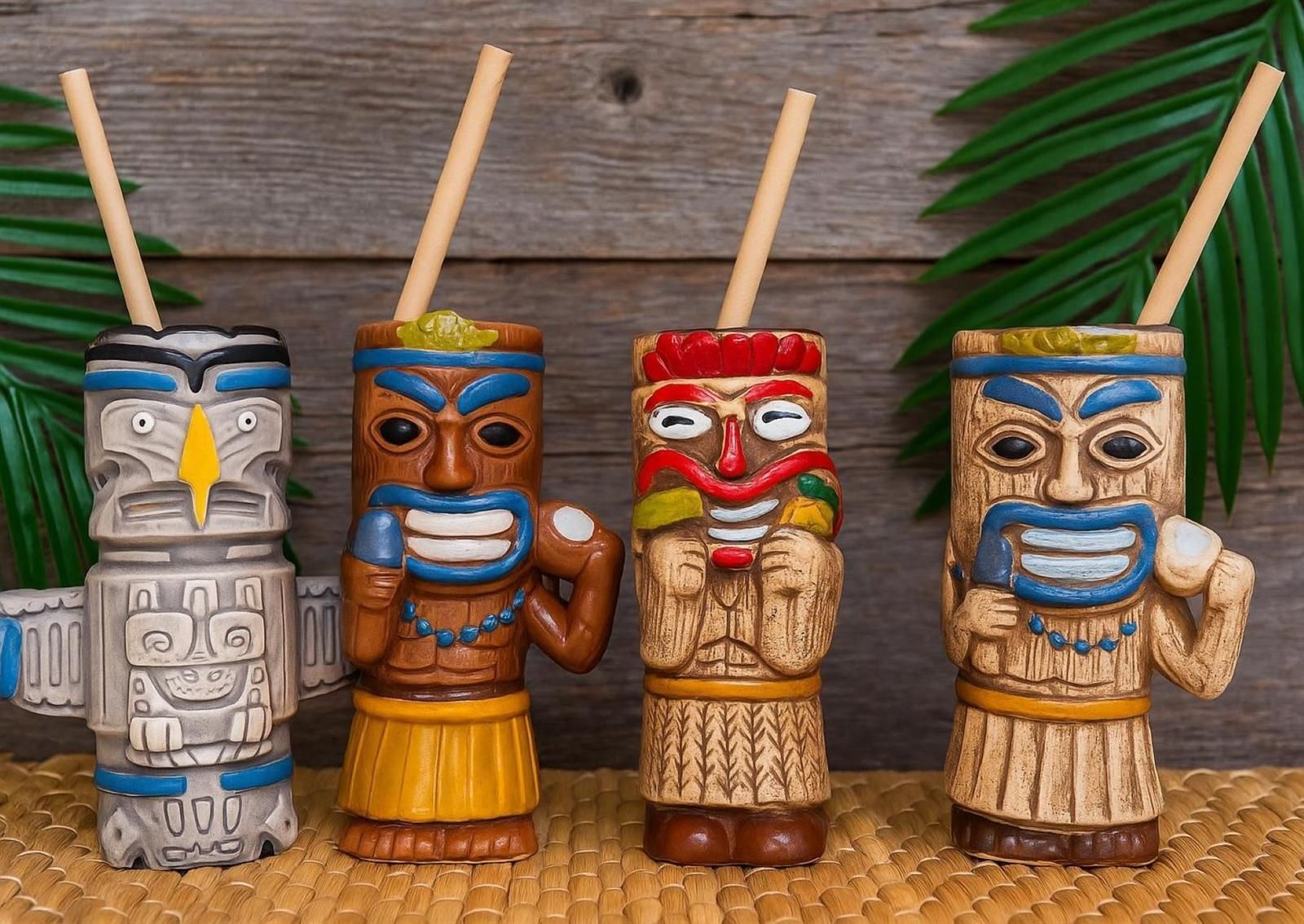 Tiki Cocktail Becher 4 Stück Diese stilvollen Tiki-Cocktailbecher sind mehr als nur Trinkgefäße – sie sind ein echtes Statement. Mit einer Höhe von 17,1cm bis 18,2cm und einem Fassungsvermögen von 430ml-480ml bieten sie die perfekte Bühne für exotische Cocktails, kreative Mixgetränke oder somm