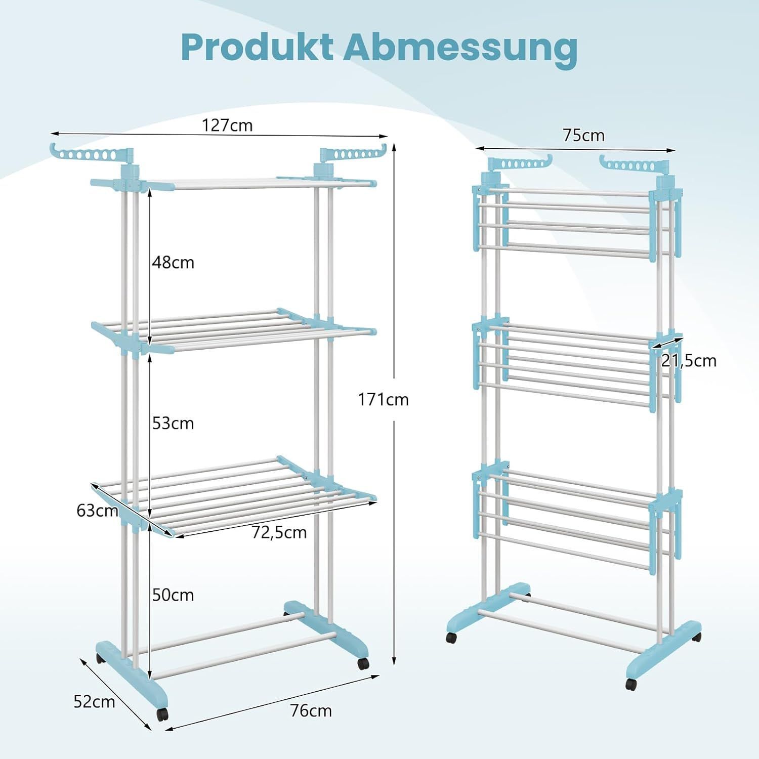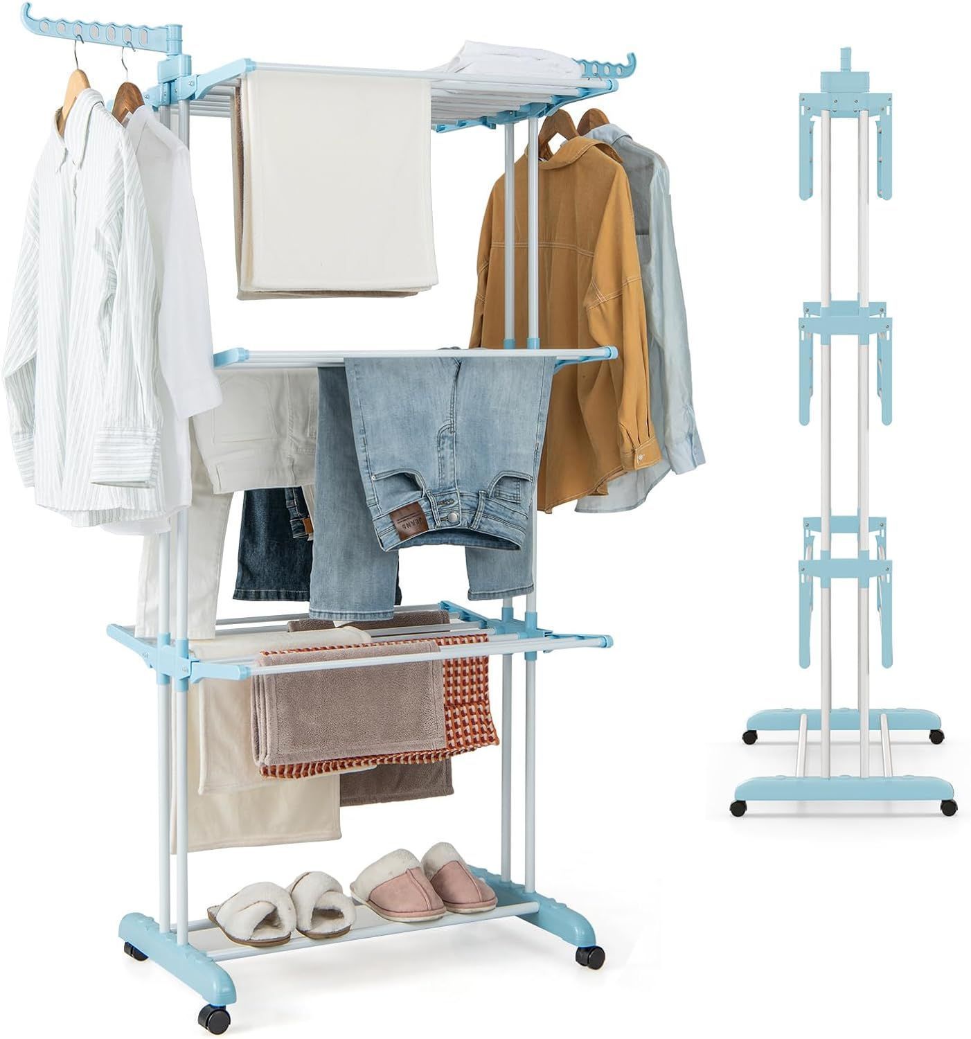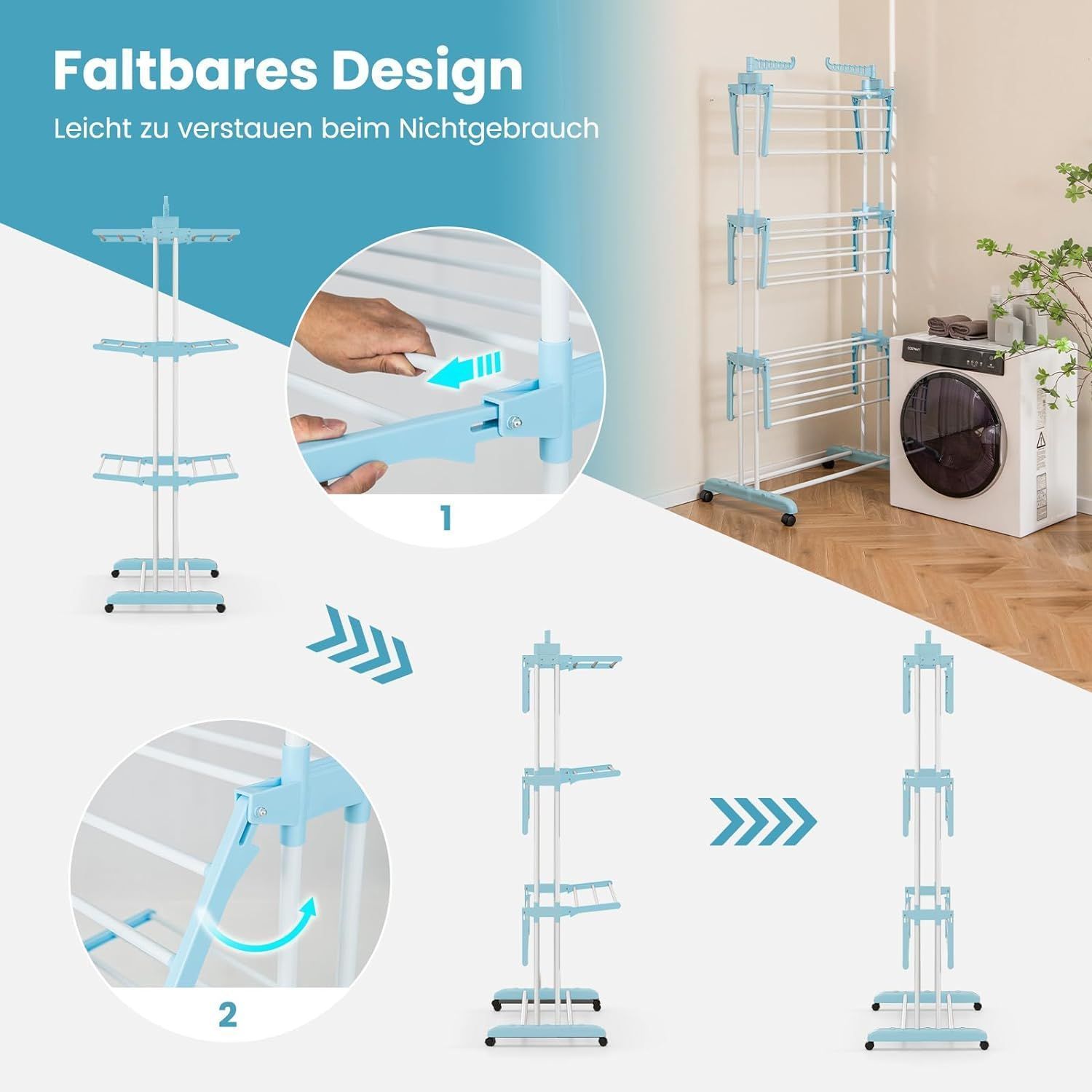 4-Stufiger Wäscheständer mit Rollen, Wäschetrockner zusammenklappbar, Standtrockner