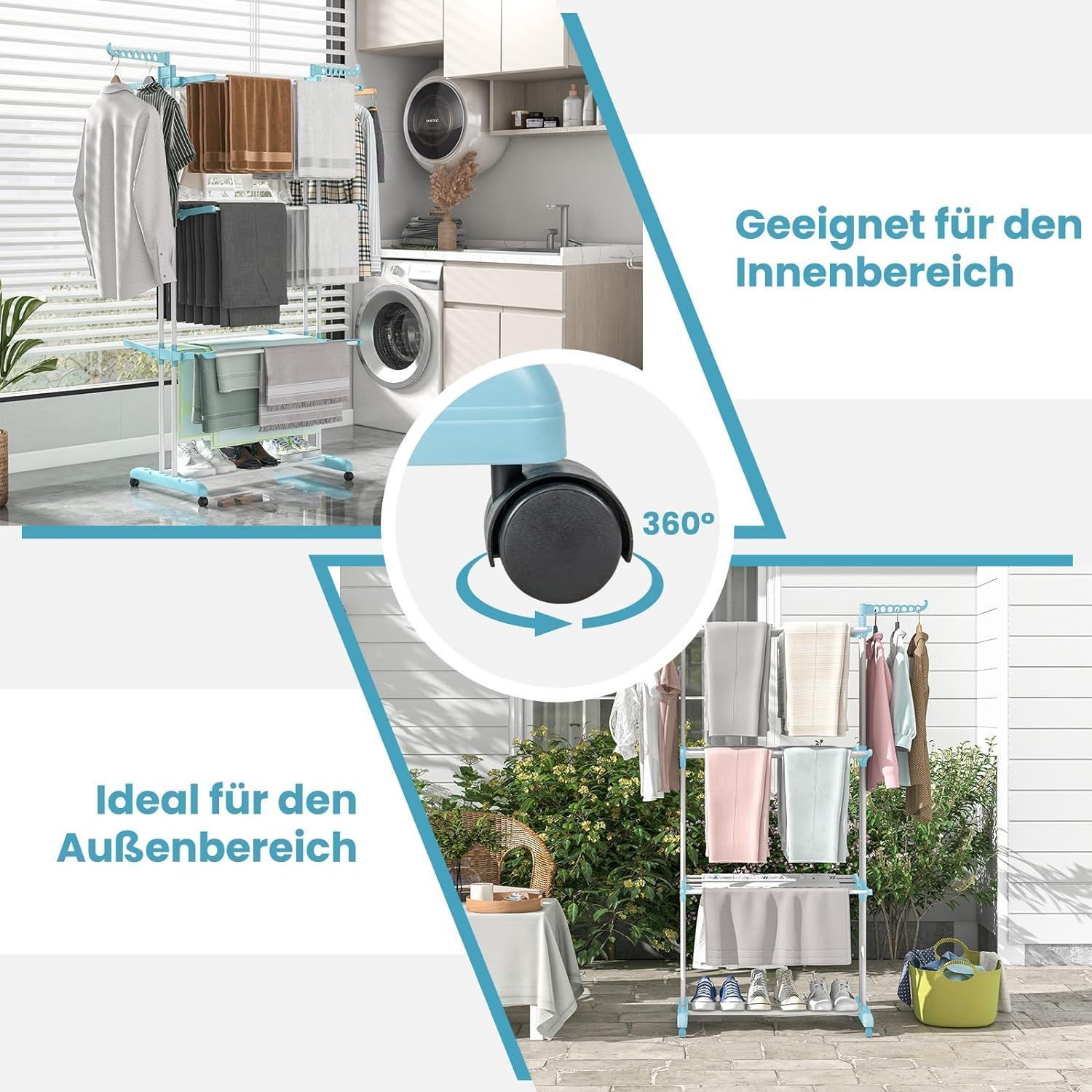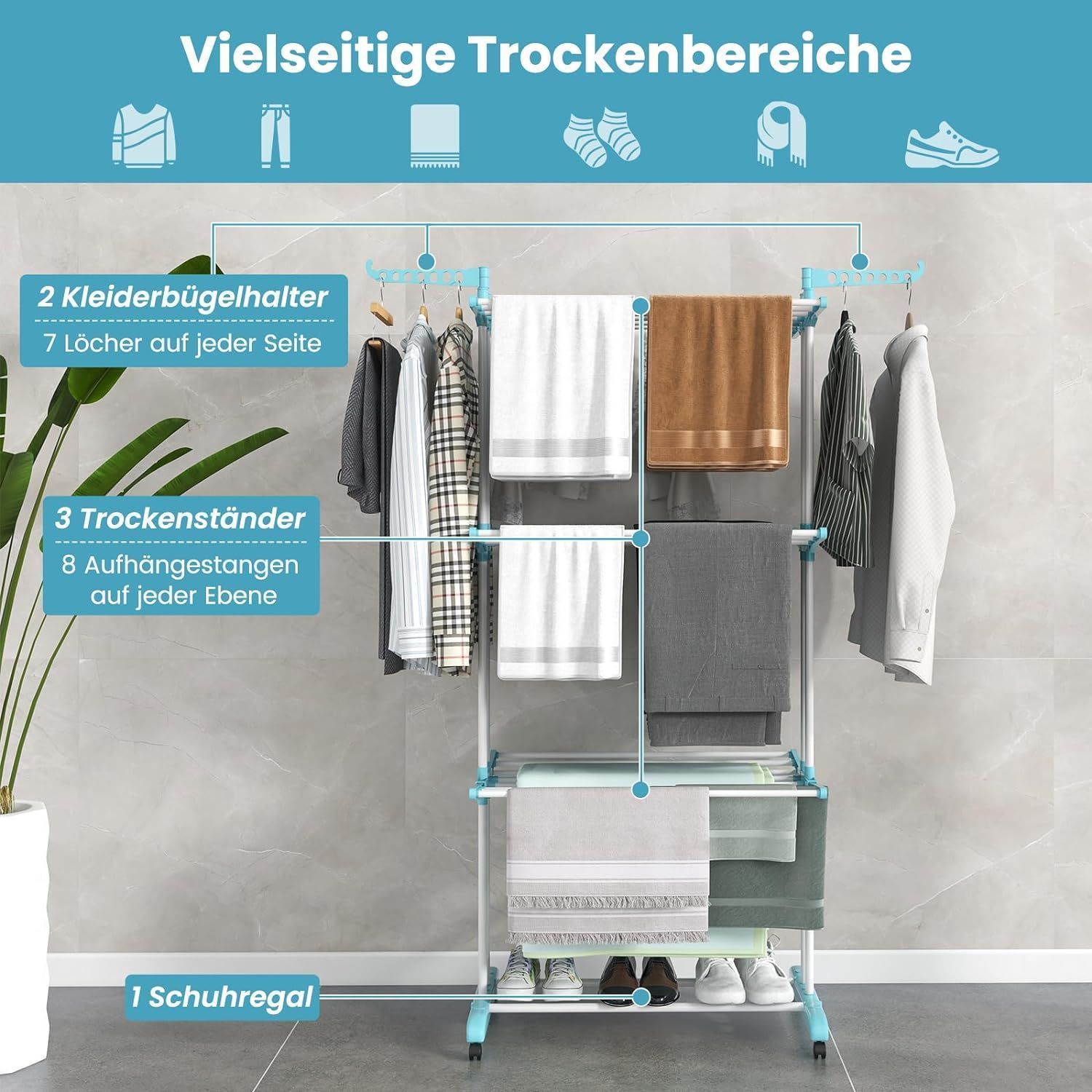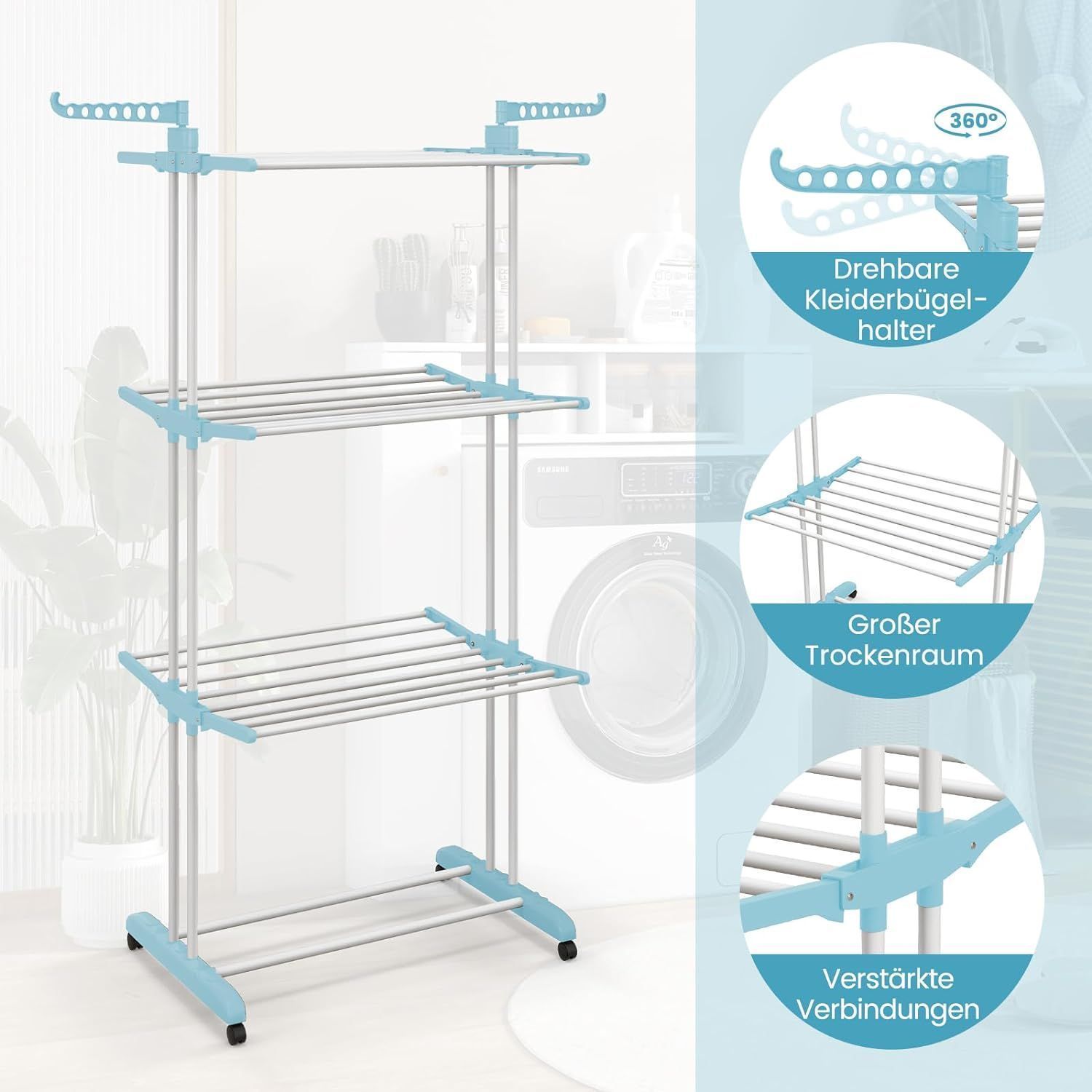 4-Stufiger Wäscheständer mit Rollen, Wäschetrockner zusammenklappbar, Standtrockner