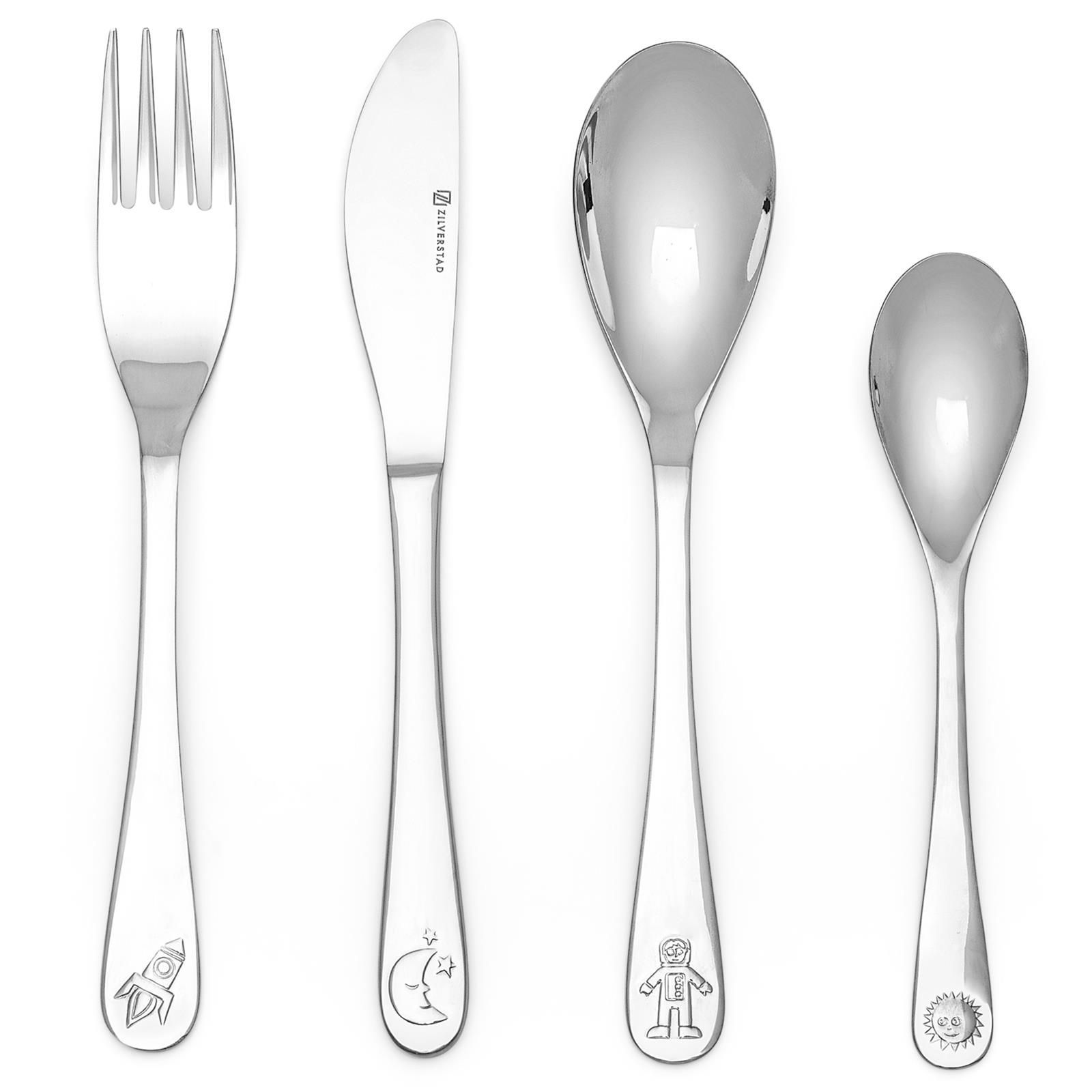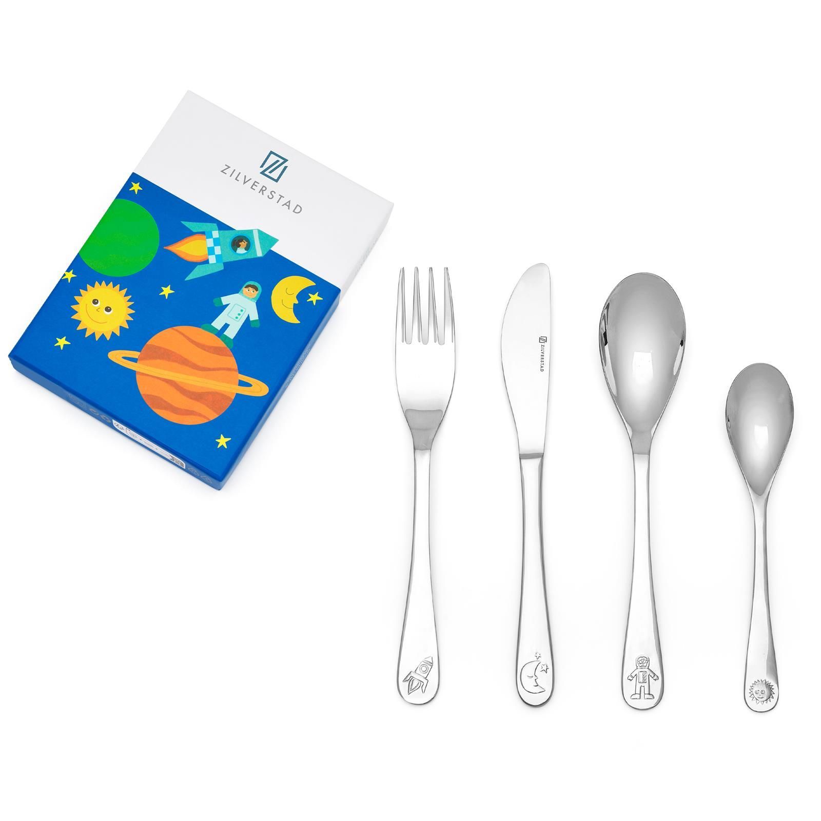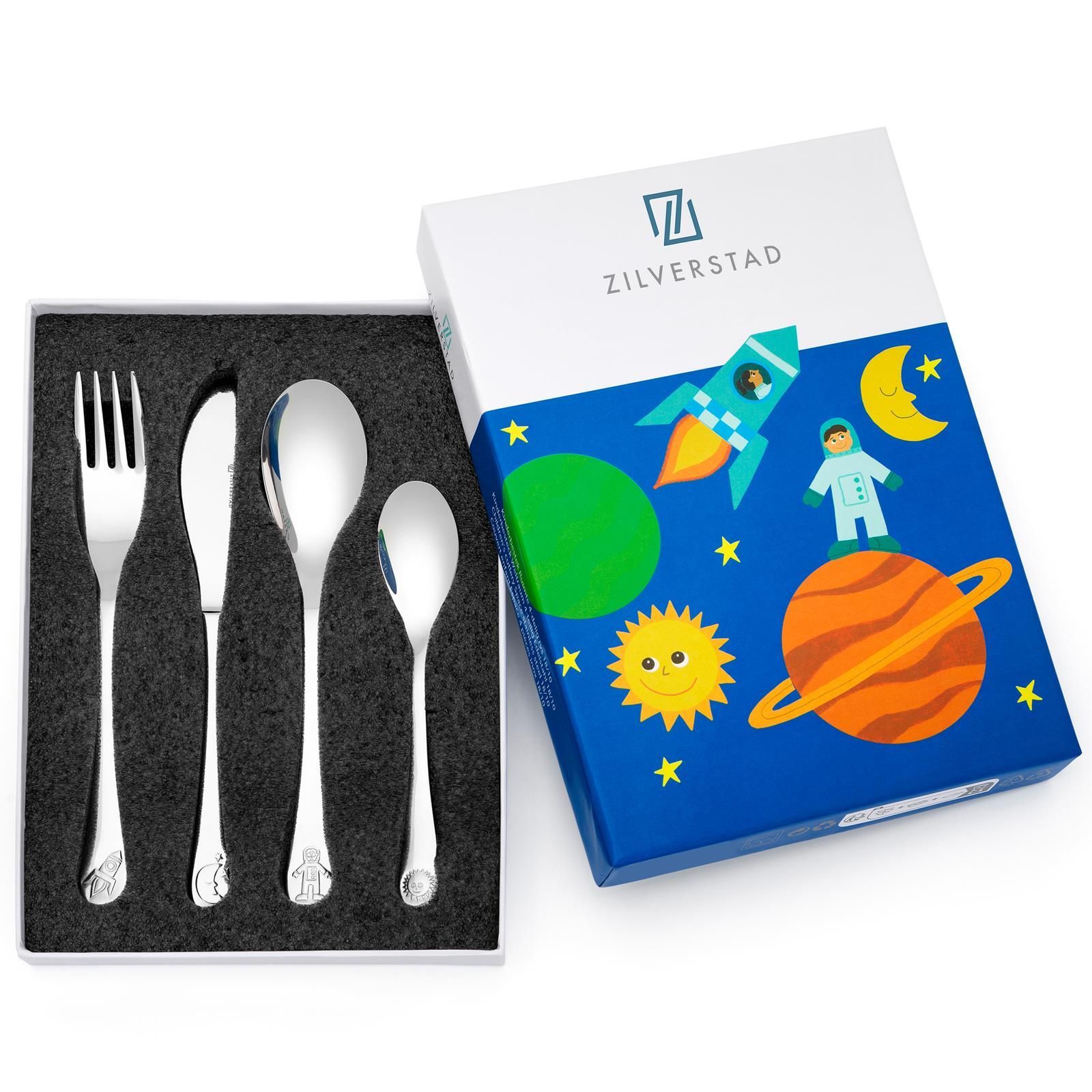 Zilverstad 4-teiliges Kinder Besteck Set 18/10 Edelstahl Essbesteck Motiv Weltraum rostfrei