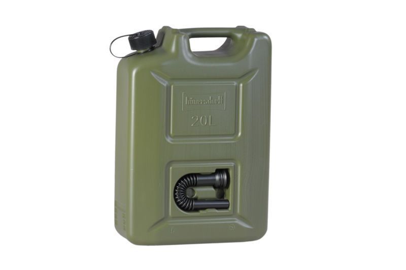 4 x 20 Liter Benzinkanister inklusive 4 Auslaufrohre Farbe oliv