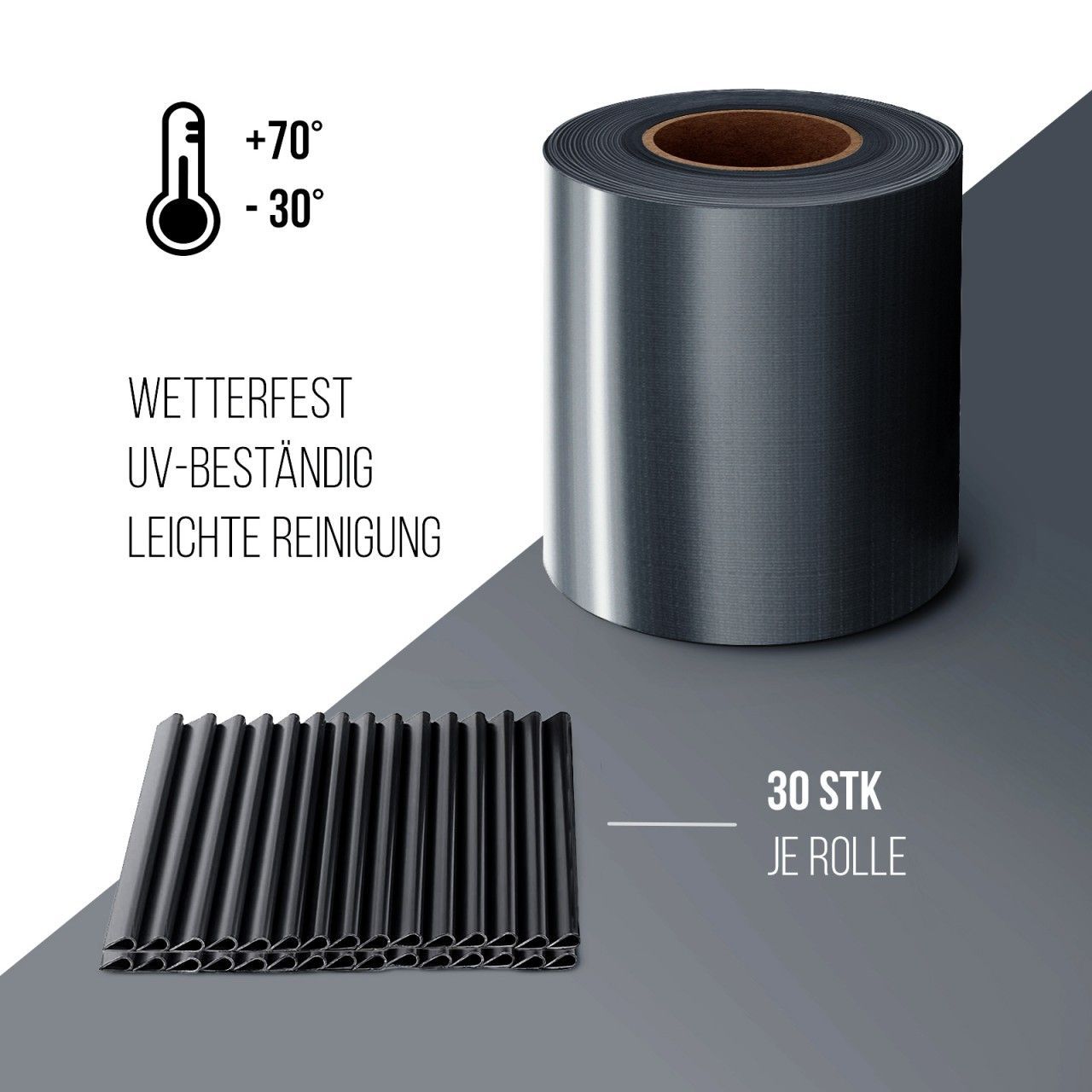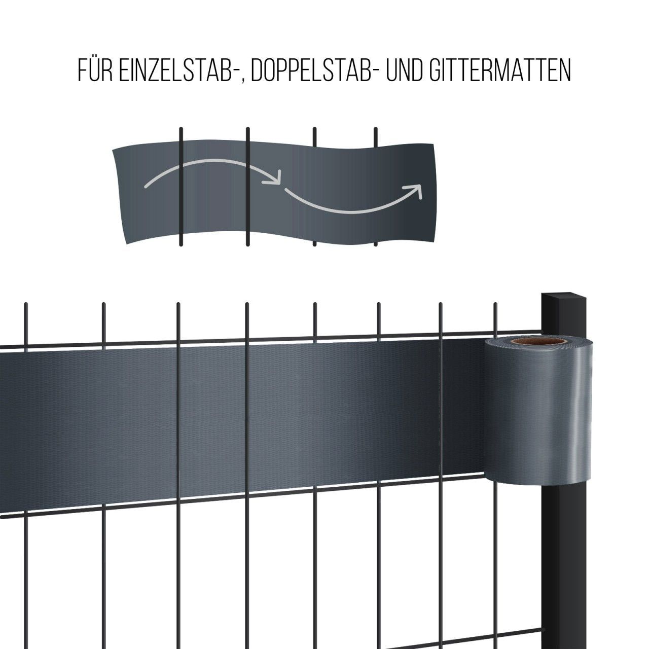 4 x MIDORI® PVC Sichtschutzstreifen 35 m x 19 cm Doppelstabmatten Zaunfolie Zaunblende Clips Anthrazit Schaffen Sie sich mit unseren hochwertigen Sichtschutzstreifen Ihr eigenes Paradies, denn das robuste Material verwandelt nahezu jeden Zaun in einen absoluten Hingucker. Unsere Sichtschutzstreifen ermöglichen Ihnen Ihren Garten oder Balkon ganz schnell und einfach zu verschönern, da die Montage völlig ohne Werkzeug geschieht. Also warten Sie nicht und lassen Sie Ihrer Kreativität freien Lauf, indem Sie Akzente setzen und gleichzeitig für mehr Privatsphäre in Ihrem Garten oder Balkon sorgen. Hochwertige Qualität für einen langanhaltenden Schutz Mit unserem robusten PVC Sichtschutz setzen Sie nicht nur auf mehr Privatsphäre in Ihrem Garten oder Balkon, sondern auch auf die beste Qualität. Das innenliegende Gewebe und die hohe Grammatur mit 450 g/m² geben dem Sichtschutz sehr robuste und äußerst reißfeste Eigenschaften, die diesen ebenso zu einem idealen Lärmschutz machen. Reflektionsarm, daher unbedenklich für den Straßenverkehr Sie können unsere Sichtschutzstreifen völlig ohne Bedenken an einer Straßenseite verwenden, da diese so konzipiert sind, dass sie besonders reflektionsarm sind und keinesfalls den Straßenverkehr beeinflussen. Witterungs-, UV-beständig, schmutzabweisend Sie können unseren Sichtschutz an 365/366 Tagen eines Jahres verwenden. Dies ermöglicht zum einen seine besondere Beständigkeit gegenüber Temperaturen von -30°C bis zu 70°C. Zum anderen bestechen unsere Sichtschutzstreifen durch ihre UV- und Witterungsbeständigkeit sowie schmutz- und wasserabweisenden Eigenschaften. Einsatzgebiete: Einzel-/Doppelstabmattenzäune & Gittermatten Unsere PVC-Sichtschutzstreifen lassen sich hervorragend an Einzel-/Doppelstabmattenzäune und Gittermatten anbringen. Jedoch ist es auch möglich die Sichtschutzstreifen an allen Zäunen anzubringen, die vertikale Stäbe aufweisen. Zu beachten ist lediglich, dass die Stäbe einen Durchmesser von 10 mm nicht überschreiten und der Maschenabstand nicht mehr als 20 cm beträgt. Erfüllt Ihr Zaun oder Balkongeländer diese Bedingungen, so steht der Verwendung nichts mehr im Wege. Einfache Montage ohne Werkzeug & mit Spielraum für Kreativität Für die Montage unserer Sichtschutzstreifen benötigen Sie keinerlei Werkzeuge, ausschließlich eine Designidee und eventuell eine helfende Hand. Überlegen Sie sich am besten, bevor Sie loslegen, in welchen Abständen Sie die Streifen einfädeln möchten. Achten Sie darauf, dass Sie das Muster immer beibehalten und, wenn Sie am Ende angekommen sind, schneiden Sie den Streifen einfach mit einem Messer ab und schlagen den Streifen nach hinten um und befestigen Sie ihn mit einem der mitgelieferten Befestigungsclips an einem der Stäbe. Falls Sie verschiedene Flechtmethoden verwenden und verschiedenfarbige Sichtschutzstreifen miteinander kombinieren, erschaffen Sie sich ein wahres Unikat und einen kreativen Sichtschutz. Technische Daten Marke: Midori Material: PVC Materialstärke: 0,36 mm Farbe: Anthrazit Grammatur: 450 g/m² Füllfläche: ca. 6,6 m² pro Rolle Breite: 19 cm Länge: 35 m Gewicht: 3 kg Stil: Modern Besonderheiten: langlebig, leicht, lichtbeständig, reißfest, rostresistent, schmutzabweisend, wasserfest, pflegeleicht, reflektionsarm Temperaturbeständigkeit: -30°C bis 70°C UV- und Witterungsbeständig: Ja Sichtschutz: 100% Befestigungsmaterial inklusive: Ja Im Lieferumfang enthalten: 30 Befestigungsclips je Rolle Einsatzbereich: Doppelstabmattenzaun, Einzelstabmattenzaun, Gittermatten Lieferumfang 1 Rolle mit 35 m PVC-Sichtschutz 30 Befestigungsclips je Rolle Montageanleitung