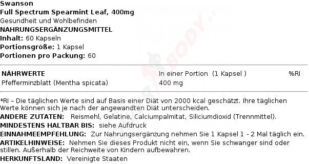 4 x Swanson Full Spectrum Spearmint Leaf, 400mg - 60 caps