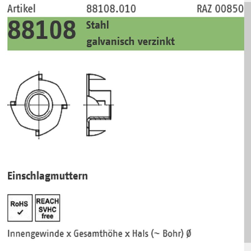 Schnelleinschlagmuttern galvanisch verzinkt für Holz mit Innengewinde M6