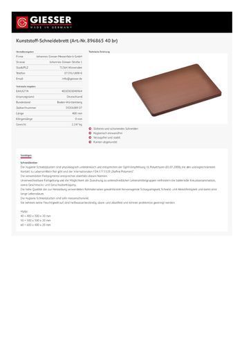 40 x 30 cm Schneidebrett Messerbrett Küchenbrett Kunststoff Giesser Messer braun