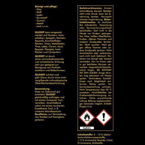 --> Beschreibung: GLOSSY reinigt und pflegt Glas, Metall, Stoff, Leder, Kunststoff, Gummi, Lack uvm. GLOSSY kann eingesetzt werden auf Fenstern, Autoscheiben, Spiegeln, Kacheln, Keramik, Kunststoffoberflächen, Türen, Metallteilen, Vinyl, Leder, Chrom, Acryl, Resopal, Plexiglas, Lackflächen und Compu... Mehr
