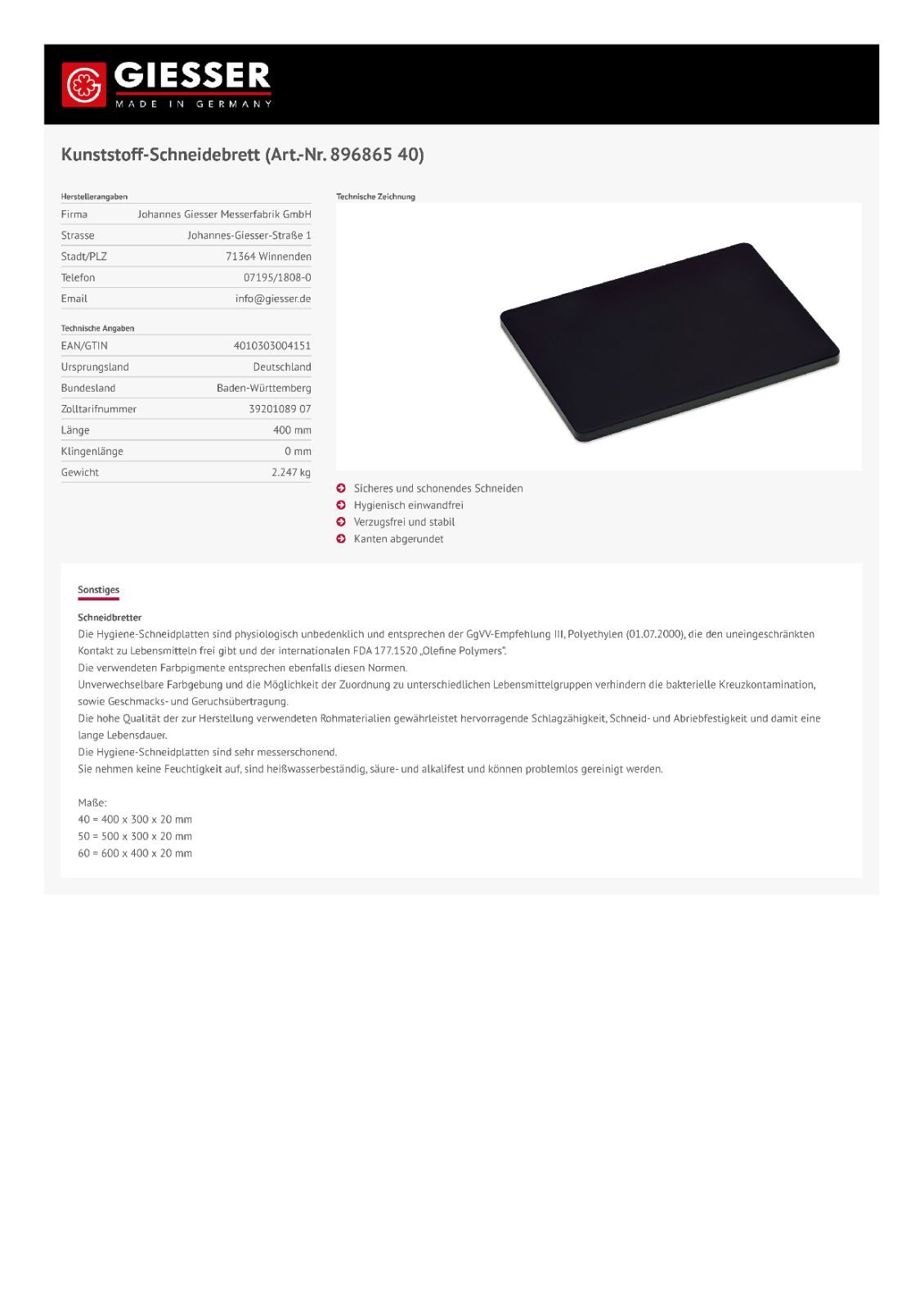 40x30 cm Schneidebrett Messerbrett Küchenbrett Kunststoff Giesser Messer schwarz