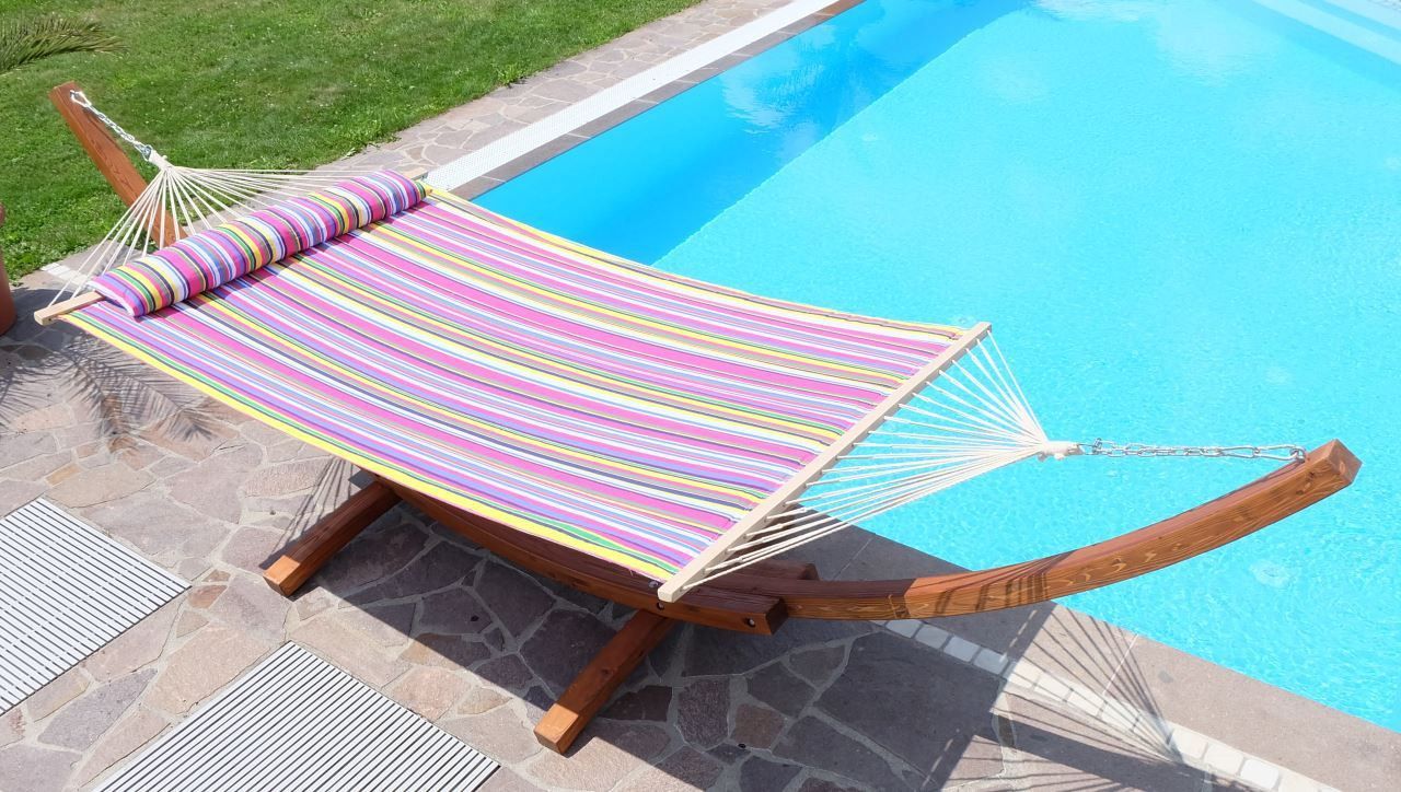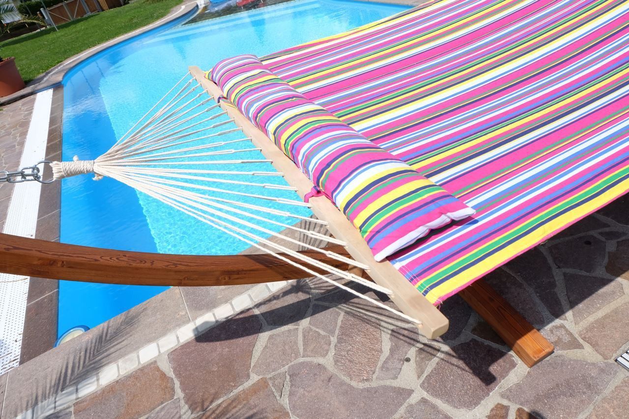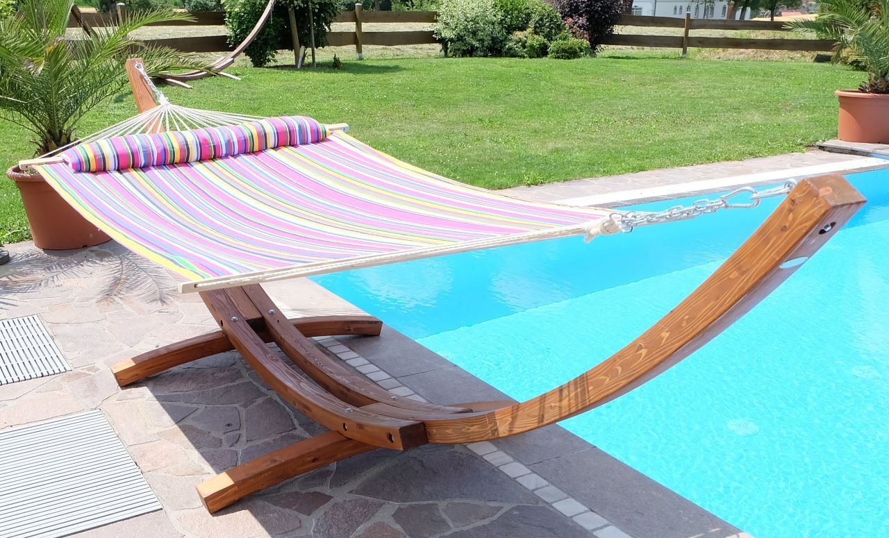 ALEOS. AS-S 410cm XXL Hängemattengestell FILLED EDITION PINK Hängematte mit Gestell aus Holz Lärche mit Stabhängematte (GEPOLSTERT) inkl. Kopfkissen