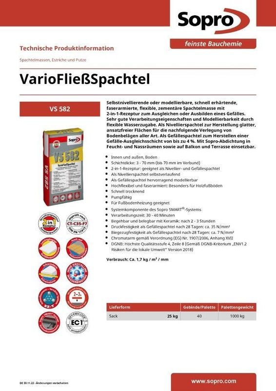 42 x Sopro VarioFließSpachtel VS 582 Ausgleichsmasse 25 kg