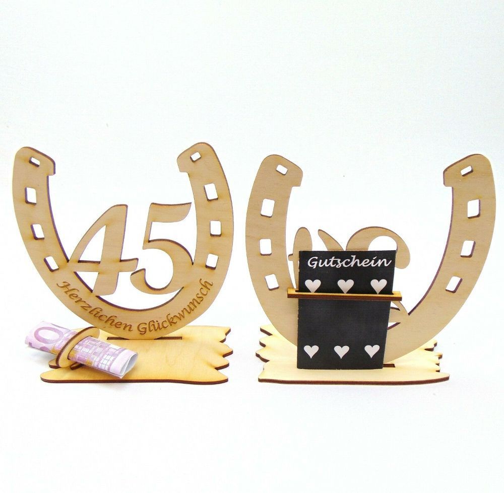 45 Geburtstag, Geldgeschenk, Hufeisen aus Holz mit Glückwunsch Gravur 16cm