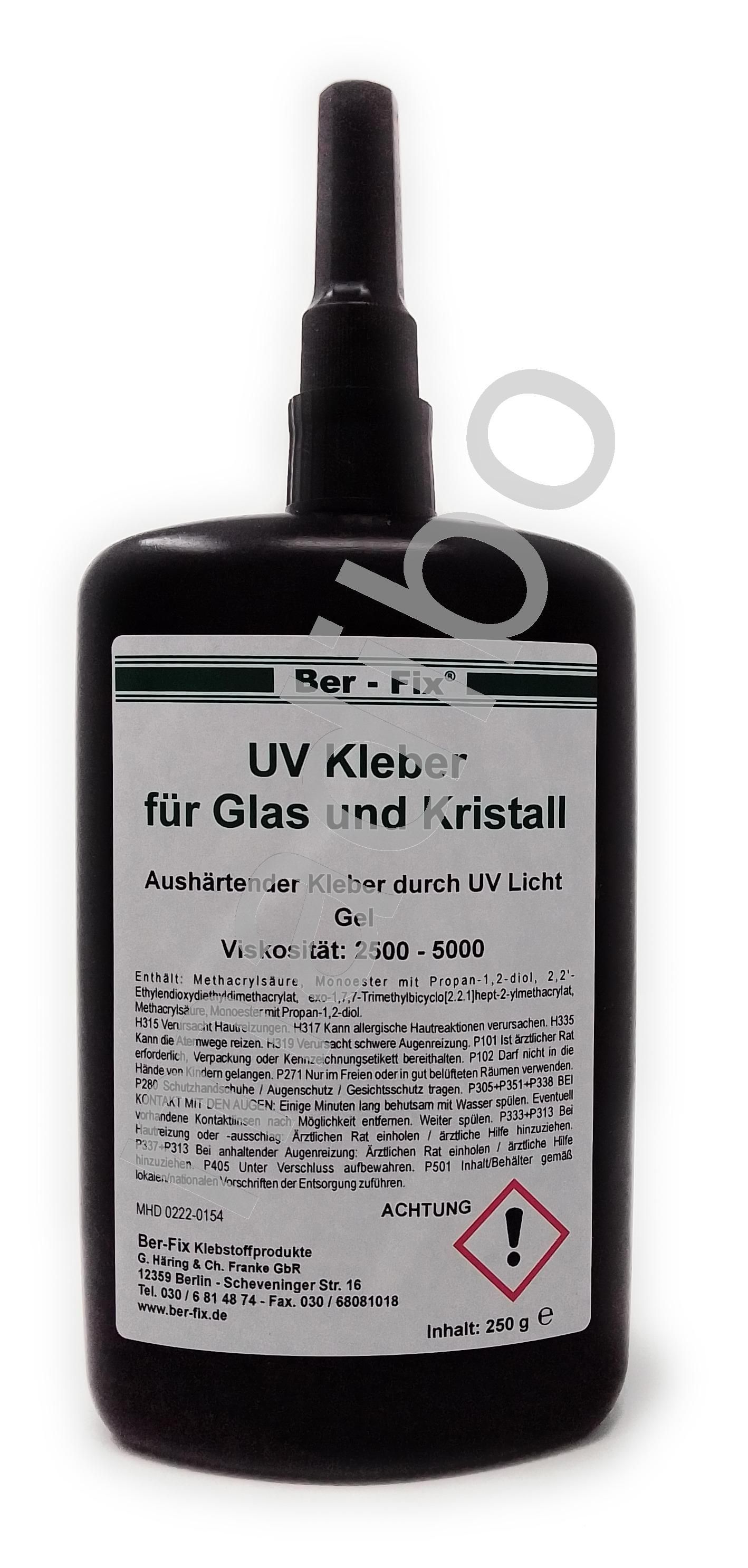 Ber-Fix UV-Kleber - Inhalt: 250 Gramm - Viskosität: hochviskos Ber-Fix UV-Kleber niedrigviskos ist ein spezieller UV-Licht-härtender Acrylat-Klebstoff, der direkt für Verklebungen mit Glas und Kristall (Bleikristall) entwickelt wurde. Mindestens ein Material muss das UV-Licht durchlassen (z.B. Glas-
