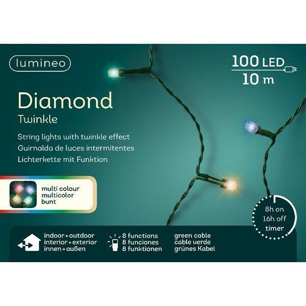 490513 Lumineo Twinkle Diamant Kette Grün 100 LED Bunt Lichterkette 990cm Timer