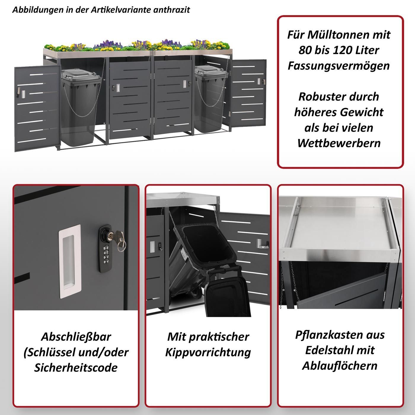 Mendler 4er-Mülltonnenverkleidung HWC-H40, Mülltonnenbox, Pflanzkasten Edelstahl-Metall-Kombi