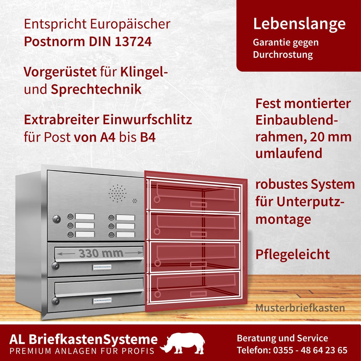 4er Premium Unterputz Briefkasten mit Klingel 4 Fach V2A Postkasten Anlage A4