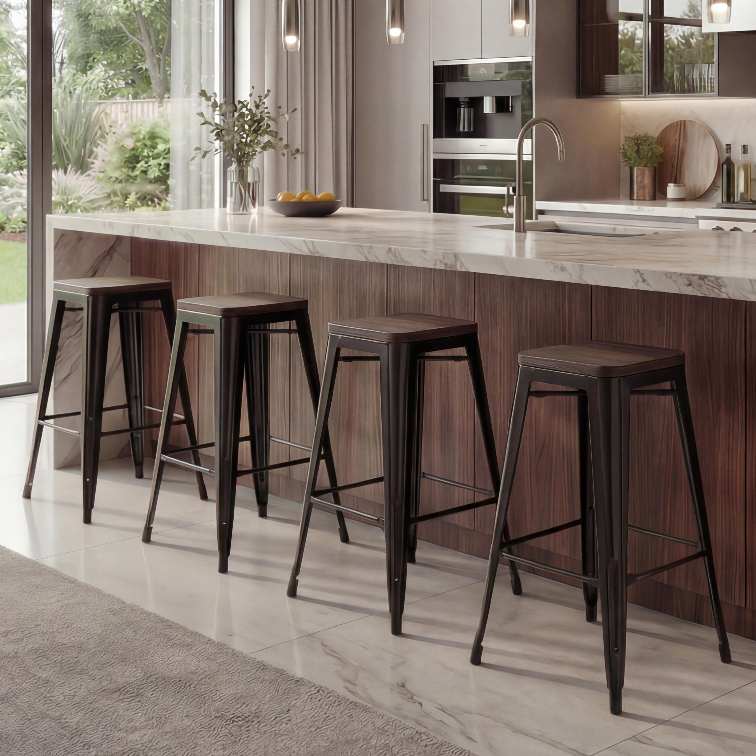 Mendler 4er-Set Barhocker HWC-A73 inkl. Holz-Sitzfläche, Barstuhl, Industriedesign stapelbar