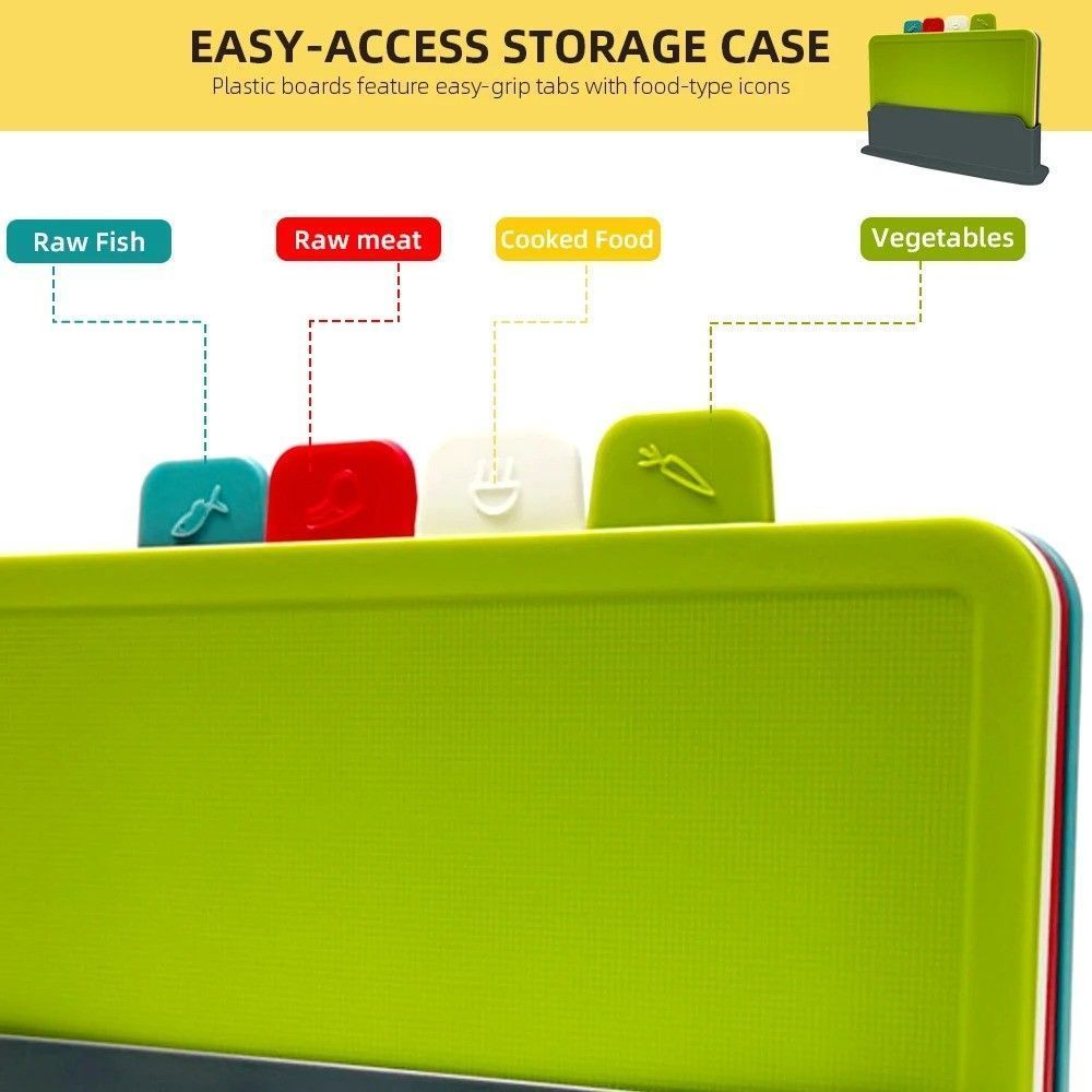 This set includes 4 color-coded, anti-bacterial plastic cutting boards with a storage holder. They are dishwasher safe, ideal for organized and hygienic kitchen use.