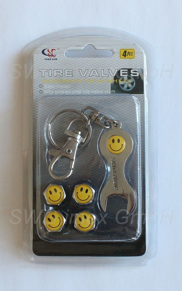 4x Auto Ventilkappe Schlüsselanhänger Ventilkappen Chrom mit Smiley Smilie Logo