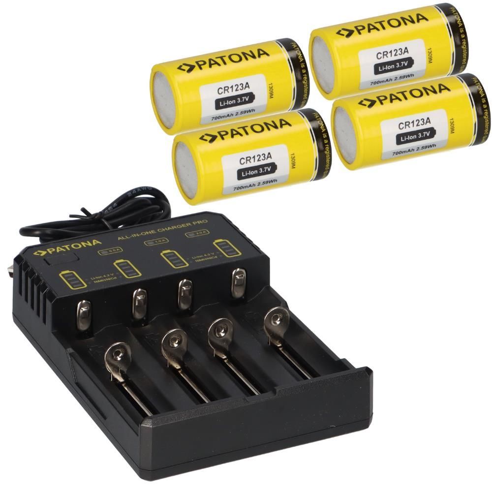 4x PATONA Li-Ion 3,7V Akku CR123A 700mAh 2,59Wh + Lader