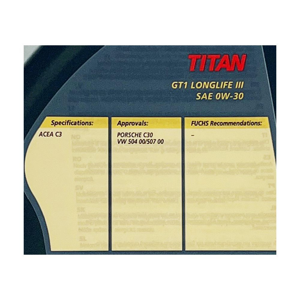 Fuchs 5 L Fuchs Titan GT1 Longlife III 0W-30 | VW 504 00/507 00 | Porsche C30