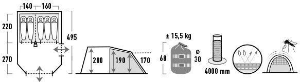 High Peak 5 Personen Tunnelzelt Bozen 5.0 495x300x200 cm 15,5 kg WS=4000mm (Gr. XL)