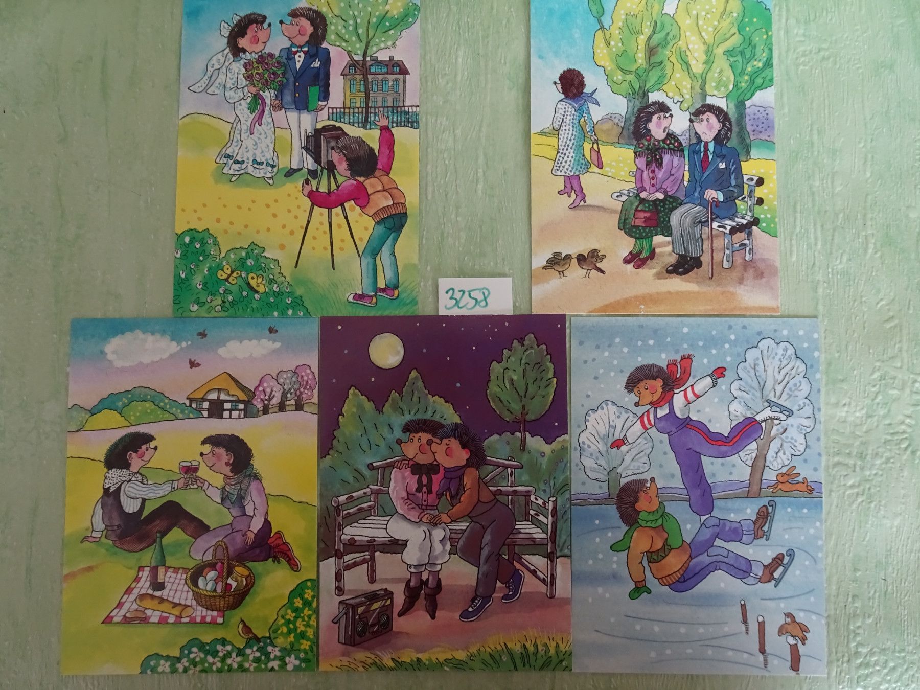 5 Postkarten AK VEB Planet Verlag Berlin Humor Scherz Liebespaar Igel vermenschlicht