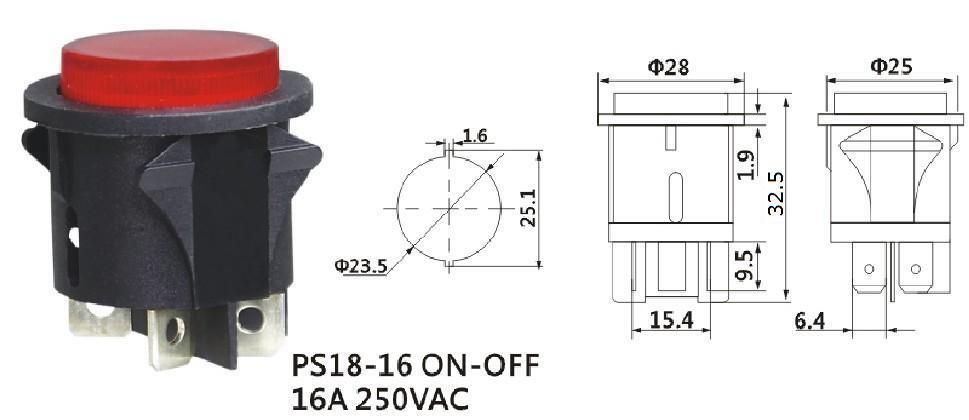 5 Stück Druckschalter Einbau ø 25mm 250V 16A rot leuchtet EIN-AUS Stecker 6,3mm