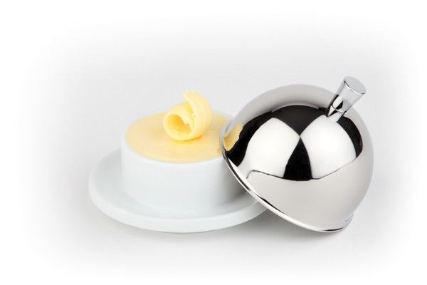 5 Stk. Klassische Butterschale mit Gloché Ausführung: Komponenten hergestellt aus Porzellan und Edelstahl hochglanzpoliert spülmaschinengeeignet Maße: Ø 9 cm - Höhe: 7 cm