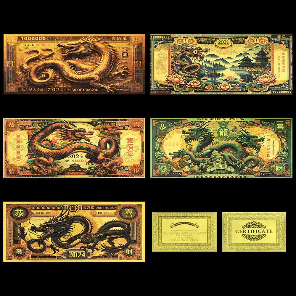5 Stück Chinesischer Drachen 2024 Goldfolie Banknoten ´+ 1 Zertifikat (CD2/24/25)